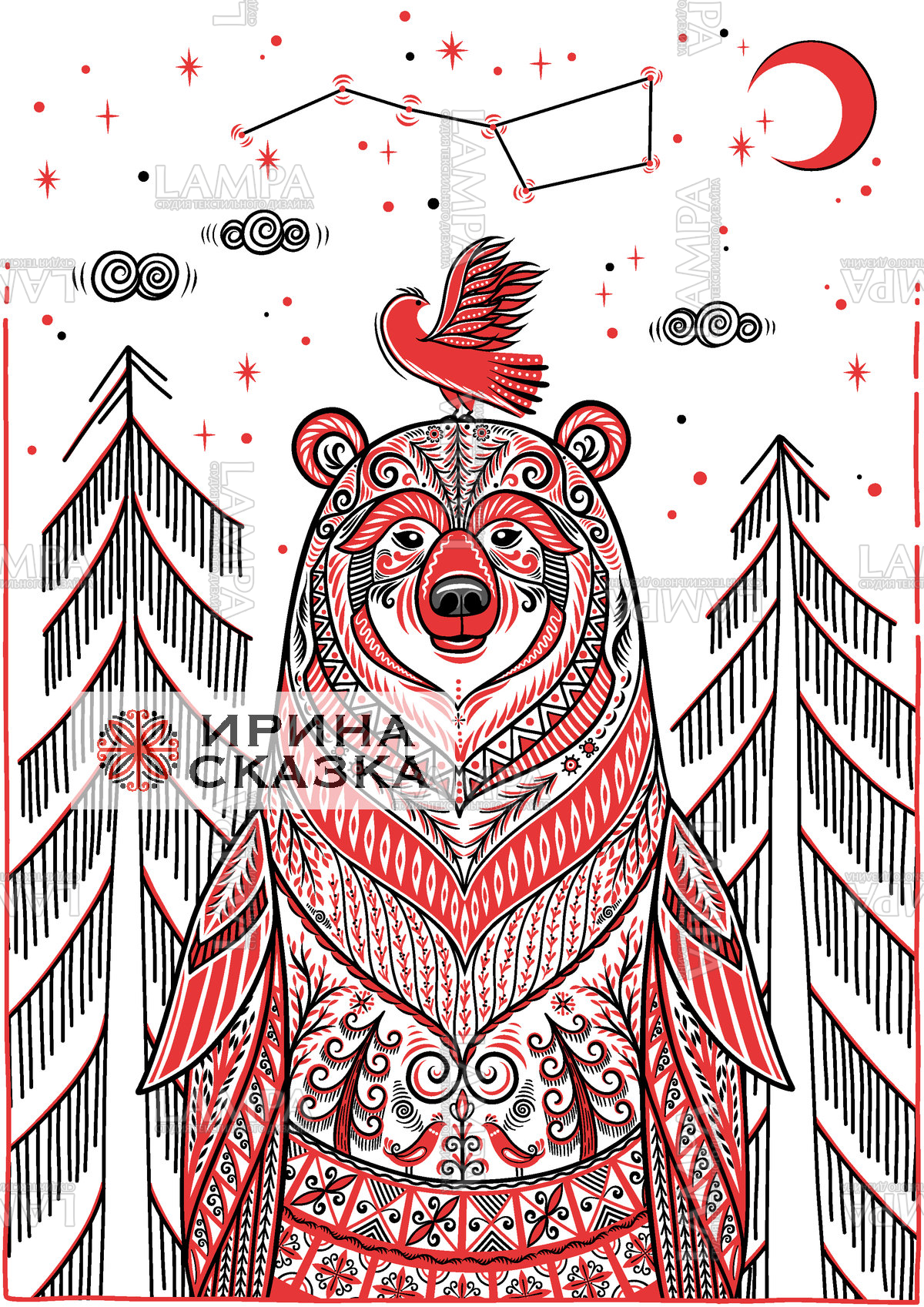 Медведица, медведь, мезень, тату, мезенская роспись, символ, русский орнамент, графика, красный, черный, созвездие, принт для одежды