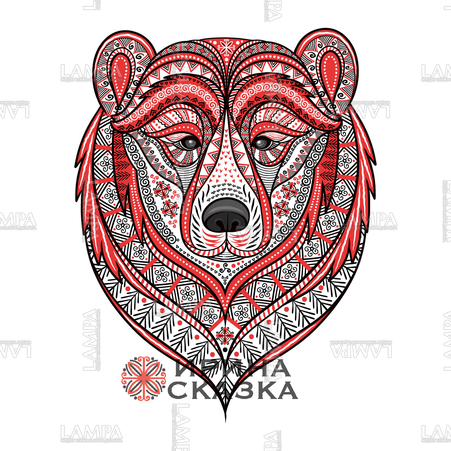 Голова медведя в стиле мезенской росписи. Дизайн для футболок, толстовок, сумок, блокнотов.. Дополнительно - орнамент в виде бордюра для создания законченной композиции (можно использовать на рукавах, горловине одежде, как дополнительное украшение).