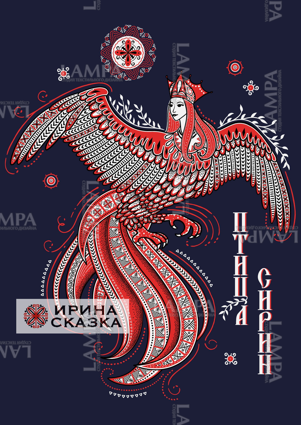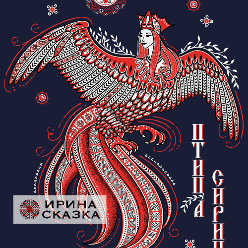 Птица Сирин, славянский, мифология, сказочный, древний, мезень, тату, мезенская роспись, русский, красный, крылья.