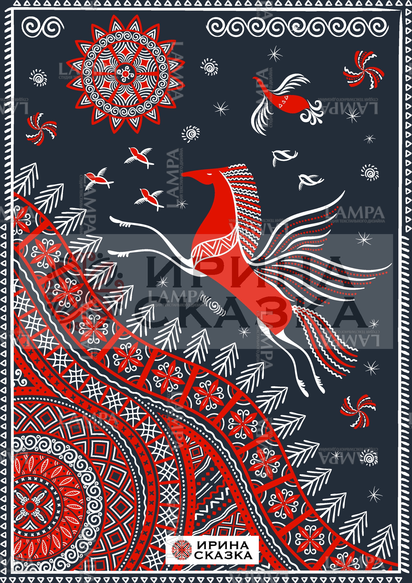 Векторная иллюстрация в стиле мезенской росписи с летящим конем, птицами над землей, украшенной орнаментами. В небе солнце - обязательный элемент мезенского стиля.