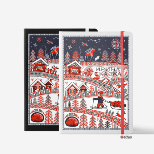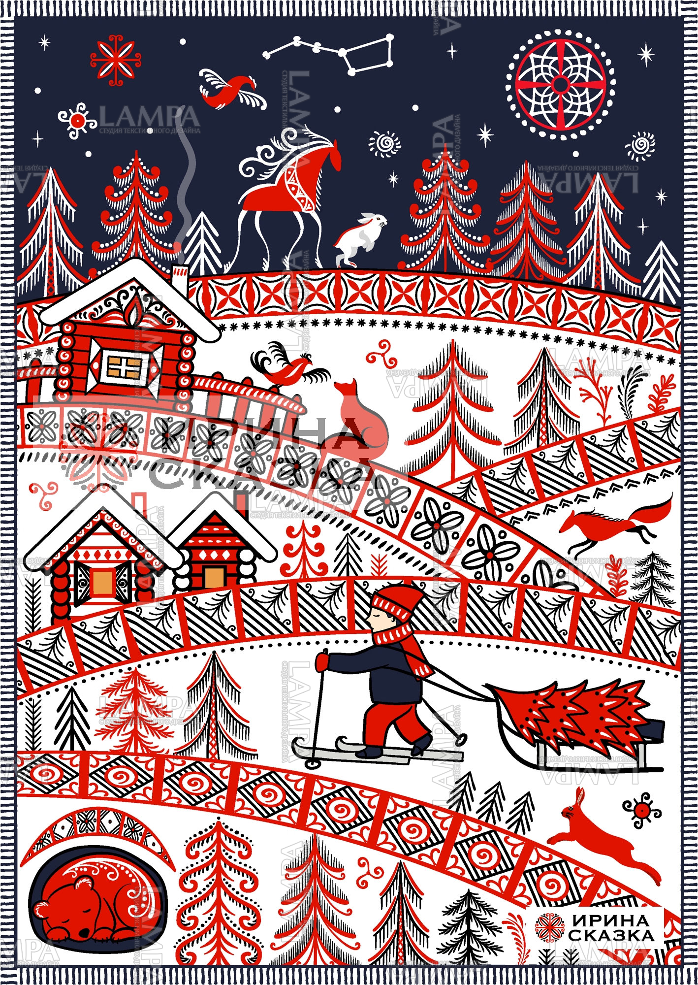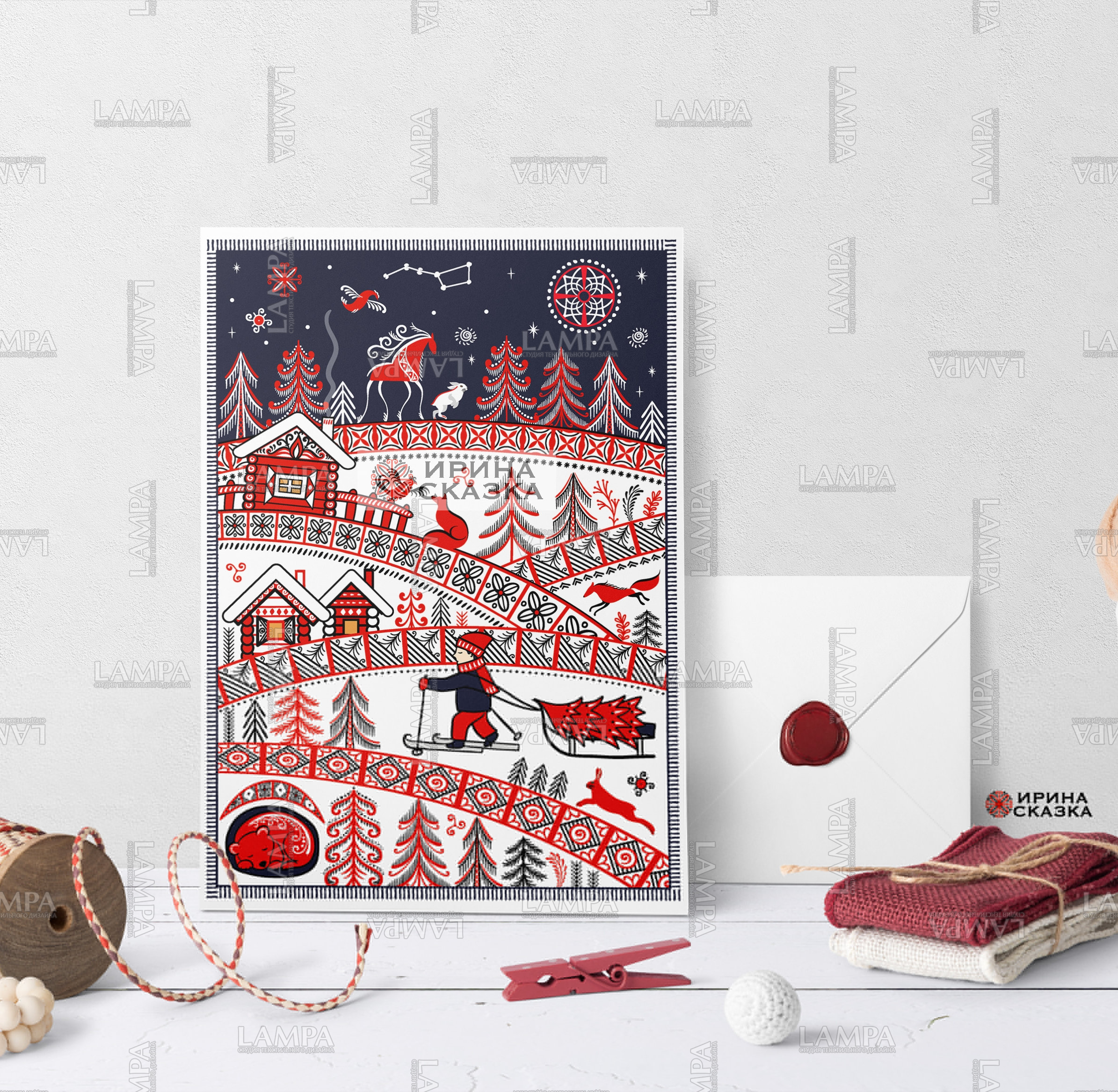 В преддверии нового года - зимняя композиция в стиле мезенской росписи для печати на открытках, блокнотах, подарочных пакетах, кружках. …