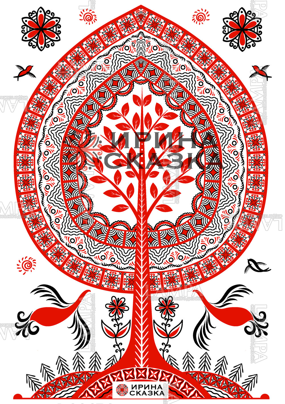 Векторная иллюстрация с орнаментами в стиле мезенской росписи. Дерево - символ жизни.