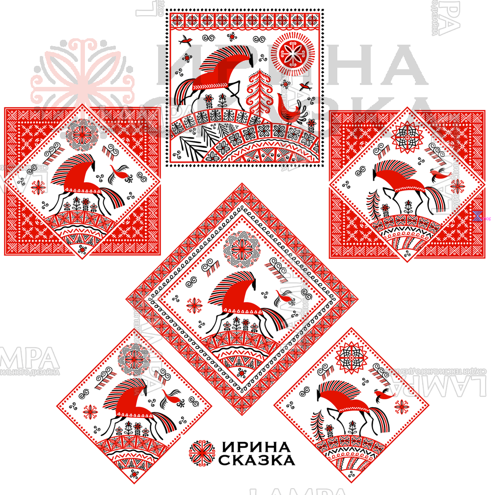 Набор иллюстраций в стиле мезенской росписи «КРАСНЫЙ КОНЬ 2026»