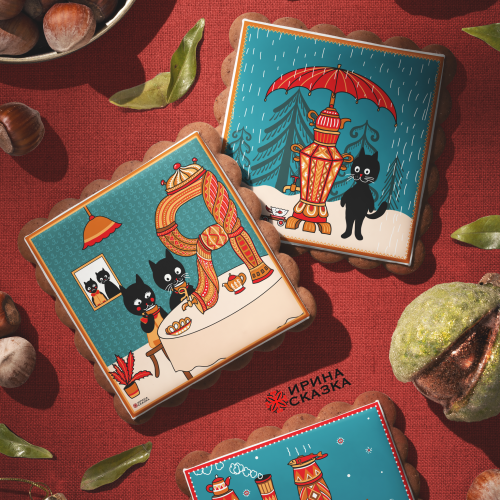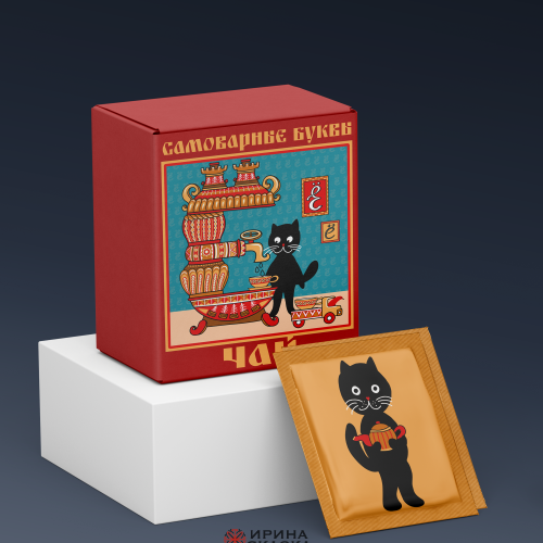 Набор состоит из 33 квадратных векторных иллюстраций, каждая из которых посвящена одной букве русского алфавита. Ключевая идея — объединение традиционной русской эстетики (самовар как символ домашнего уюта и чаепития) с игривым элементом — котом, который становится главным героем «историй» на каждой картинке.