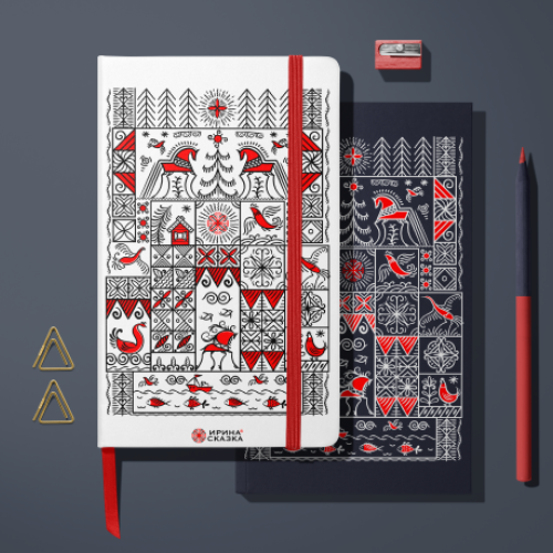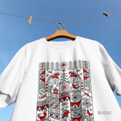 Векторная иллюстрация выполнена в аутентичном стиле мезенской росписи . Композиция строится на строгой геометрической основе: квадратные и прямоугольные модули с минималистичными сюжетами.
