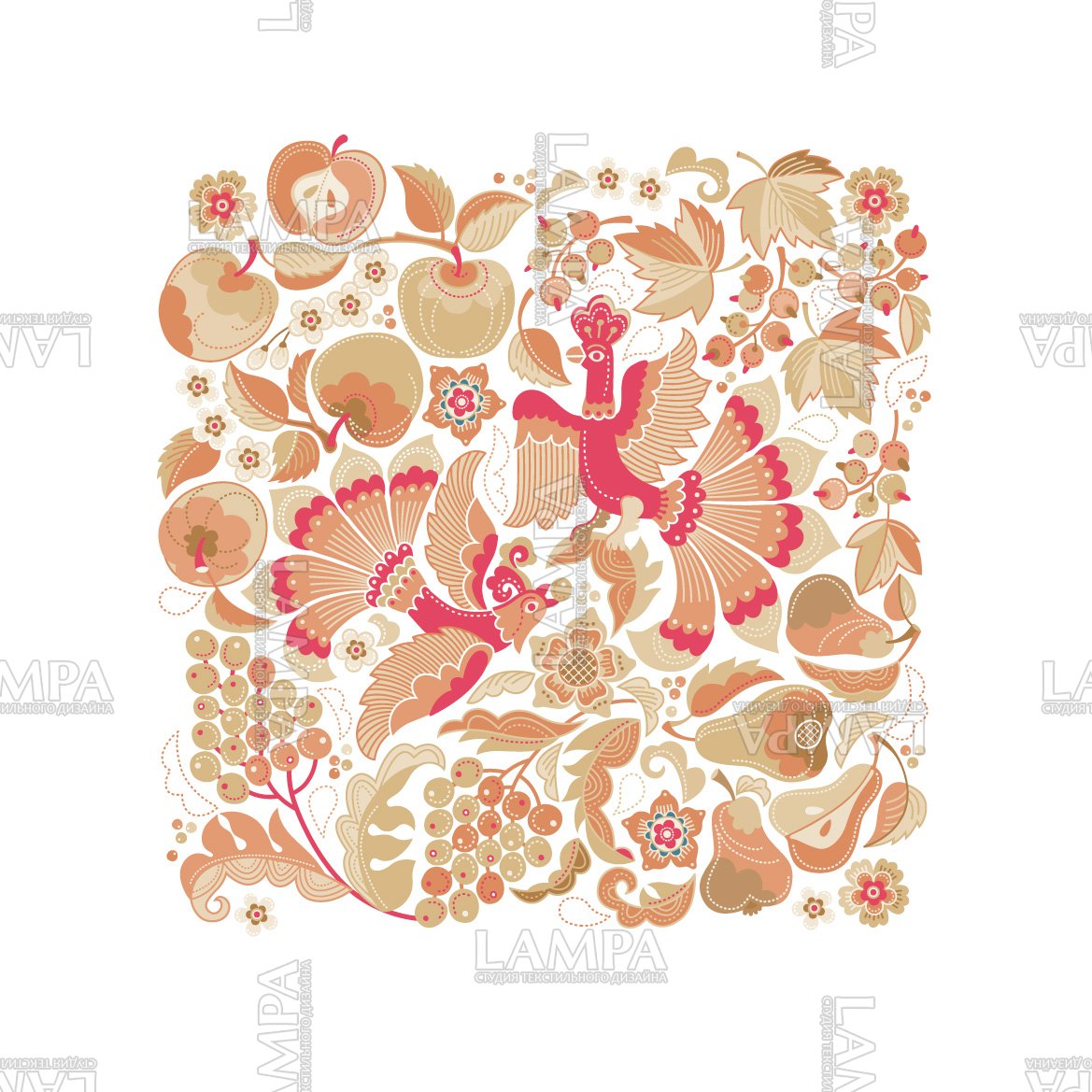 Яркий, стилизованный квадратный принт в русском стиле. Жар-птицы, цветы и плоды в русском саду.