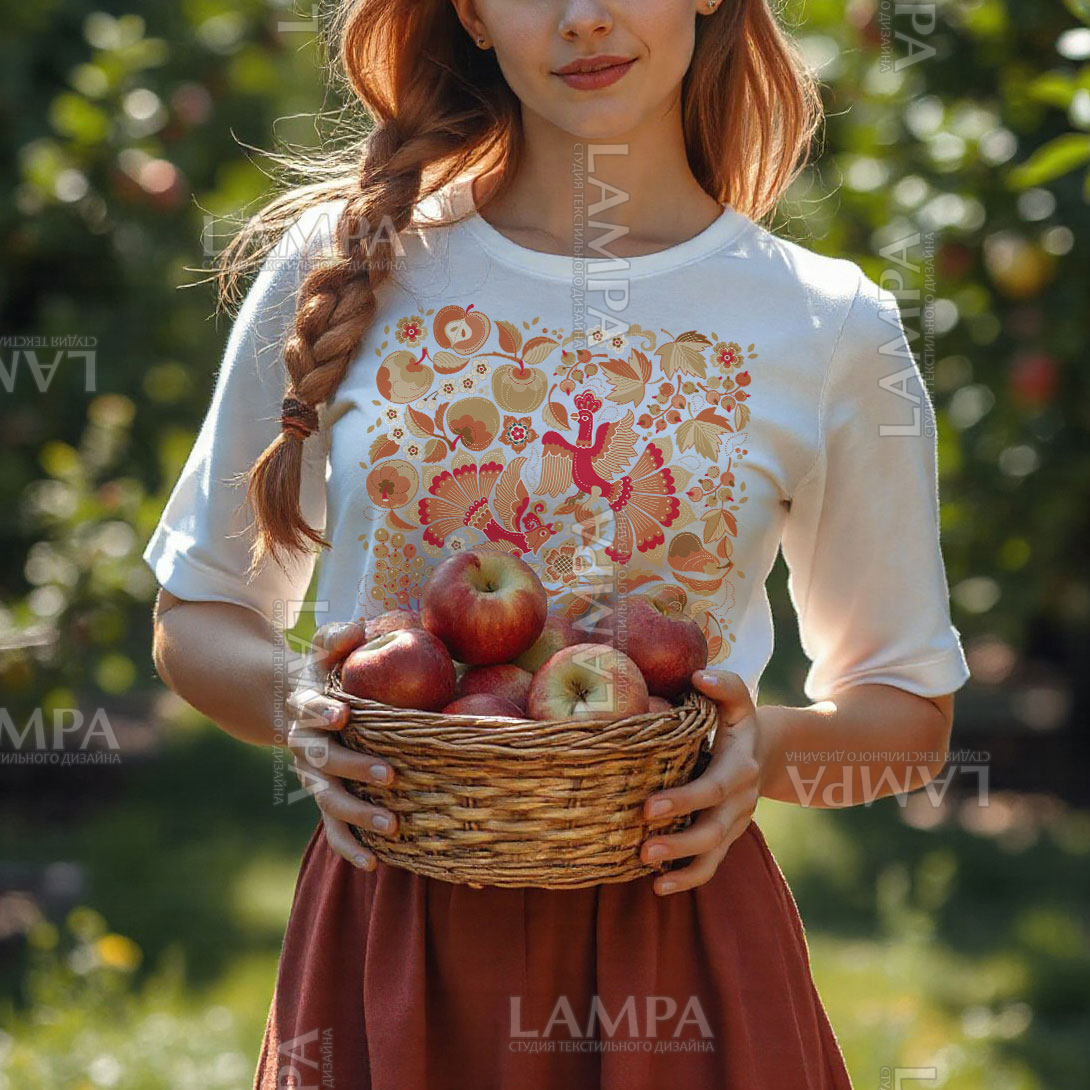 Этот принт отлично сочетается с принтом для ткани и аксессуаров «Русский сад: цветы, плоды и птицы», его возможно использовать для одежды, шопперов, аксессуаров, интерьерного и кухонного текстиля.