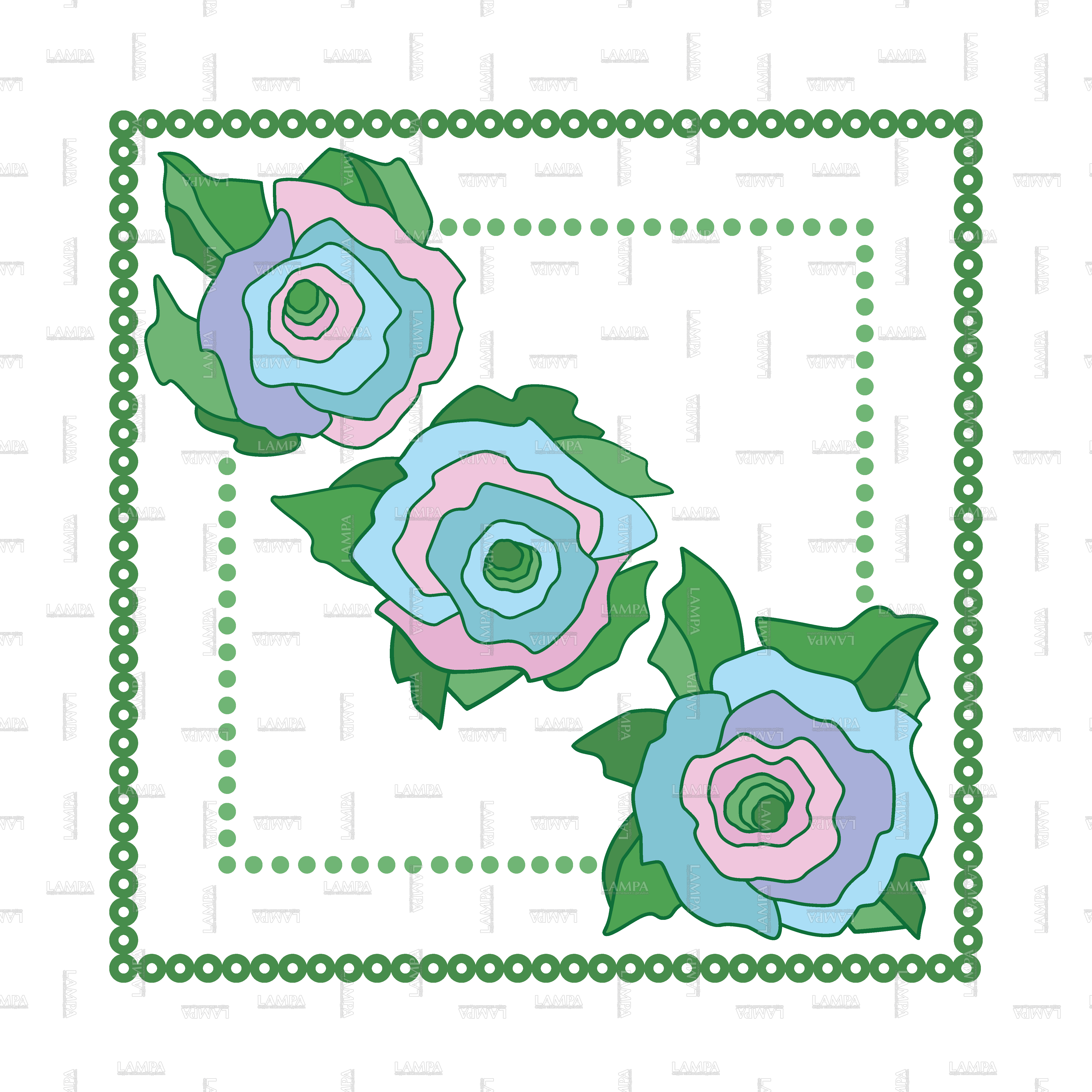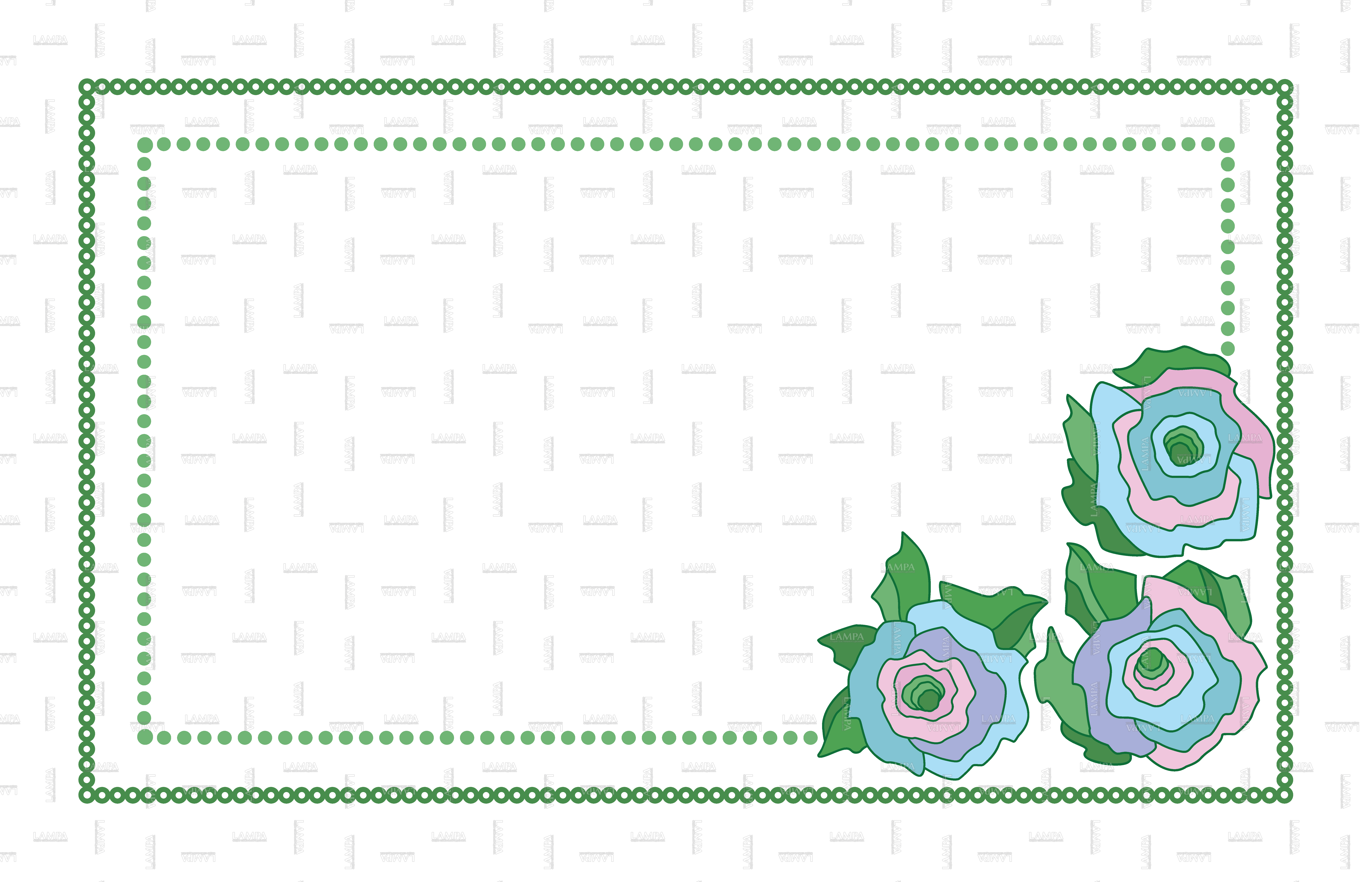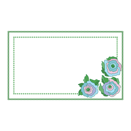 На белом или по желанию прозрачном фоне в простой рамке размещены стилизованные розы. Цветки и листва как будто вырезаны из цветной бумаги и наклеены.