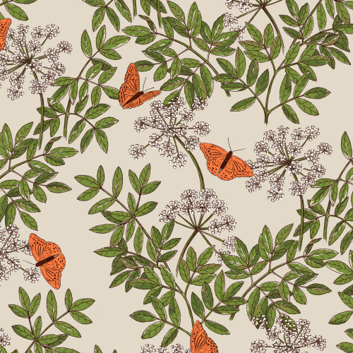 Ботанический принт для домашнего текстиля и интерьерных решений с изображением Дудника и бабочек Перламутровки.