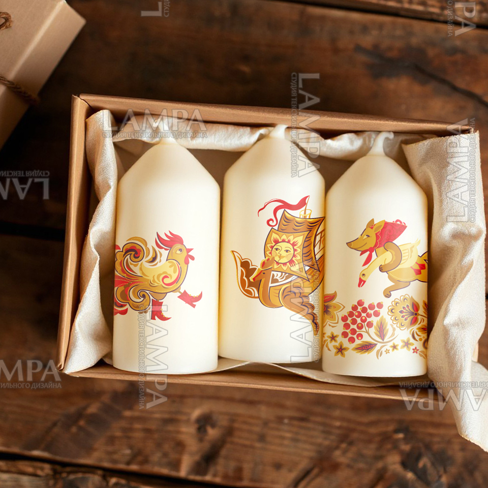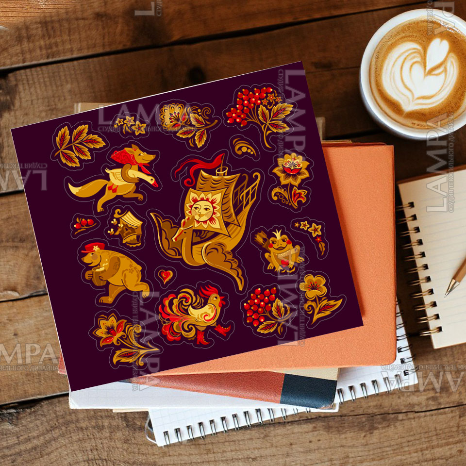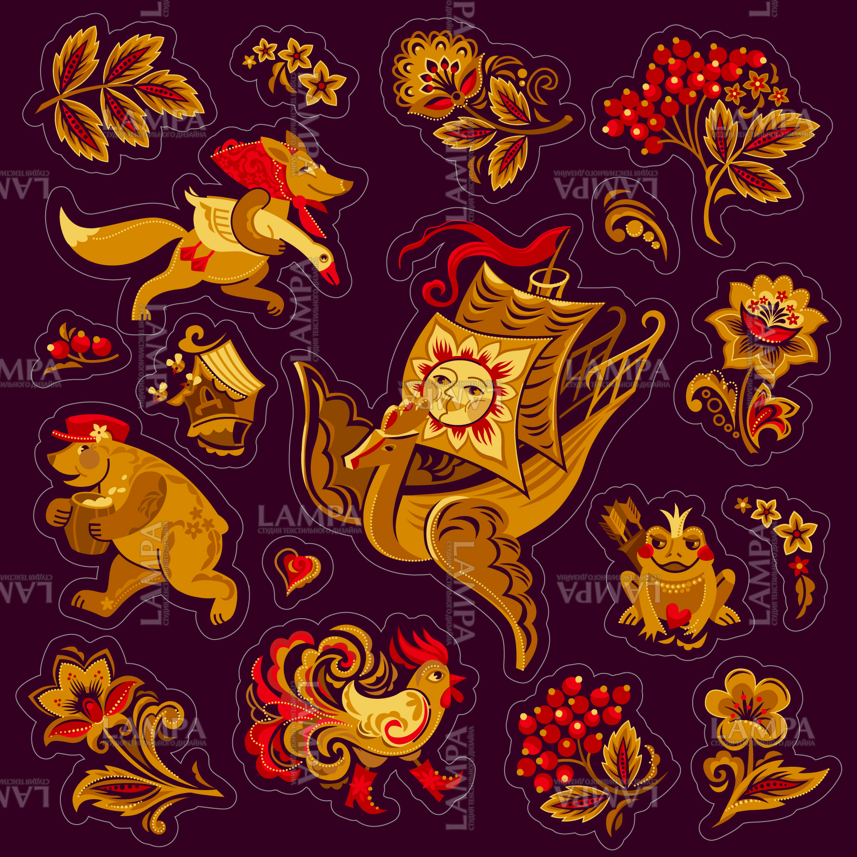 Набор векторных иллюстраций для печати на любых поверхностях. Любимые сказочные персонажи с цветочным узором по мотивам хохломской росписи в двух цветовых вариантах фона. Лиса плутовка, летучий корабль, Петя Петушок Золотой гребешок, Царевна-Лягушка, Михайло Потапыч с бочонком меда.