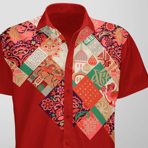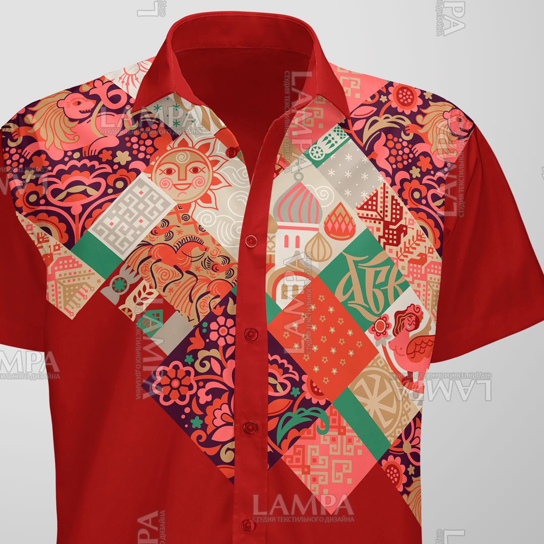 Принт «Русский пэчворк» с орнаментом, имитирующим лоскутное шитье. Цветы, геометрия, архитектурные элементы, символы и персонажи по мотивам узоров, росписей, орнаментов народов России. Эта иллюстрация в русском стиле подходит для одежды, аксессуаров, открыток, стаканчиков для напитков, упаковки, интерьерного декора, оформления фирменного стиля, рекламных материалов.