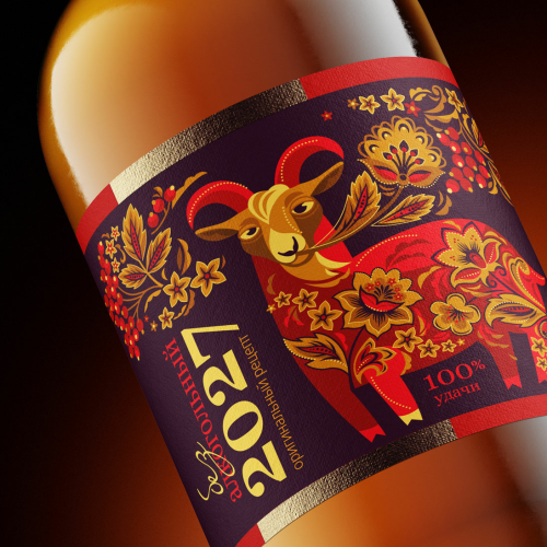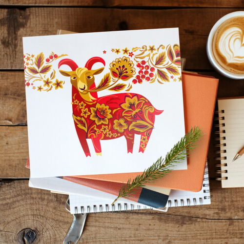 Огненная коза, символ 2027 года в китайском календаре. Козел философ с цветочным узором по мотивам хохломской росписи в двух цветовых вариантах фона.