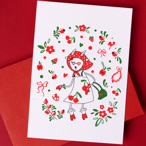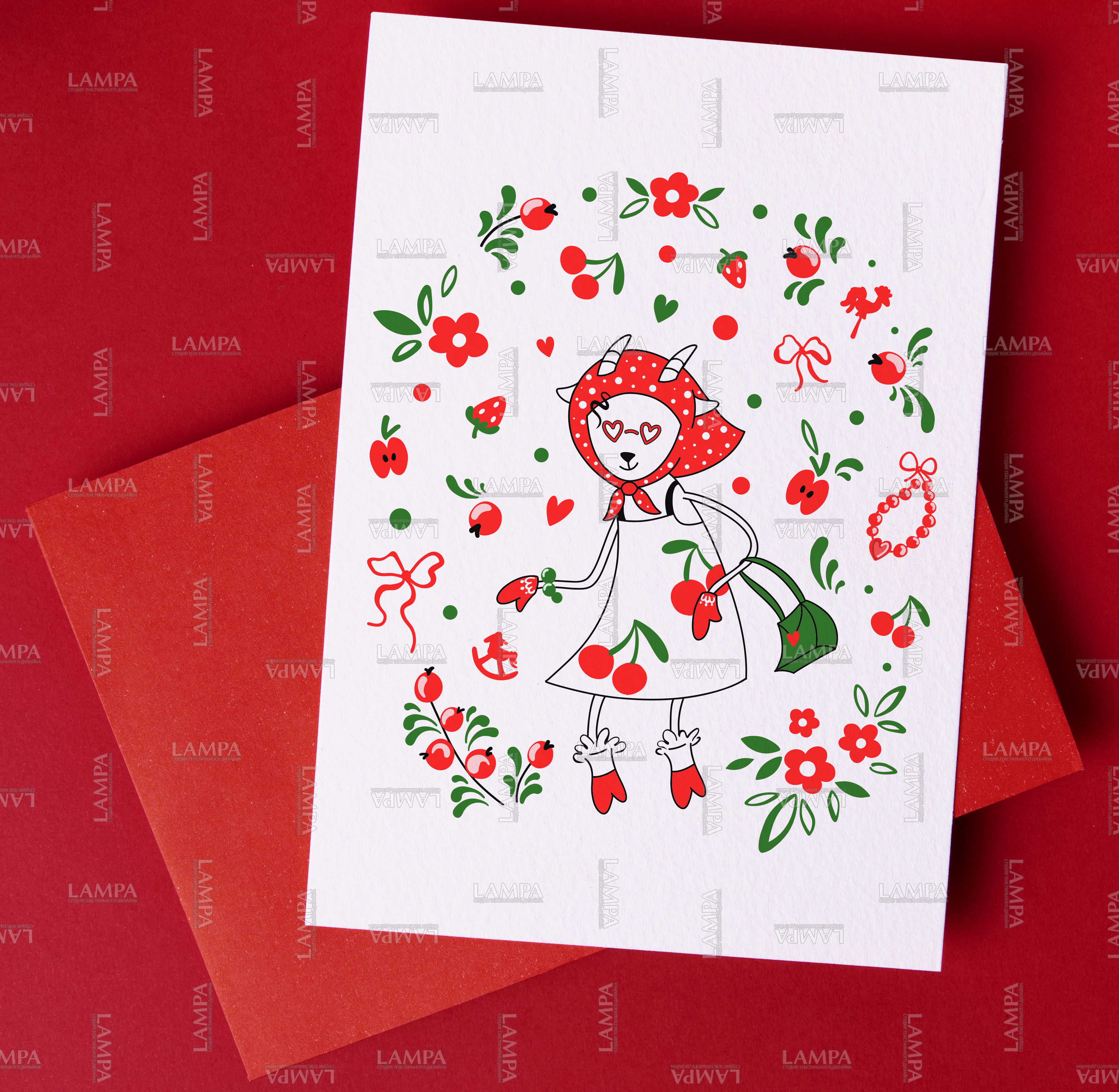 коза, козочка, год козы, модница, символ 2027, новый год, красный, зеленый, сказка, открытка