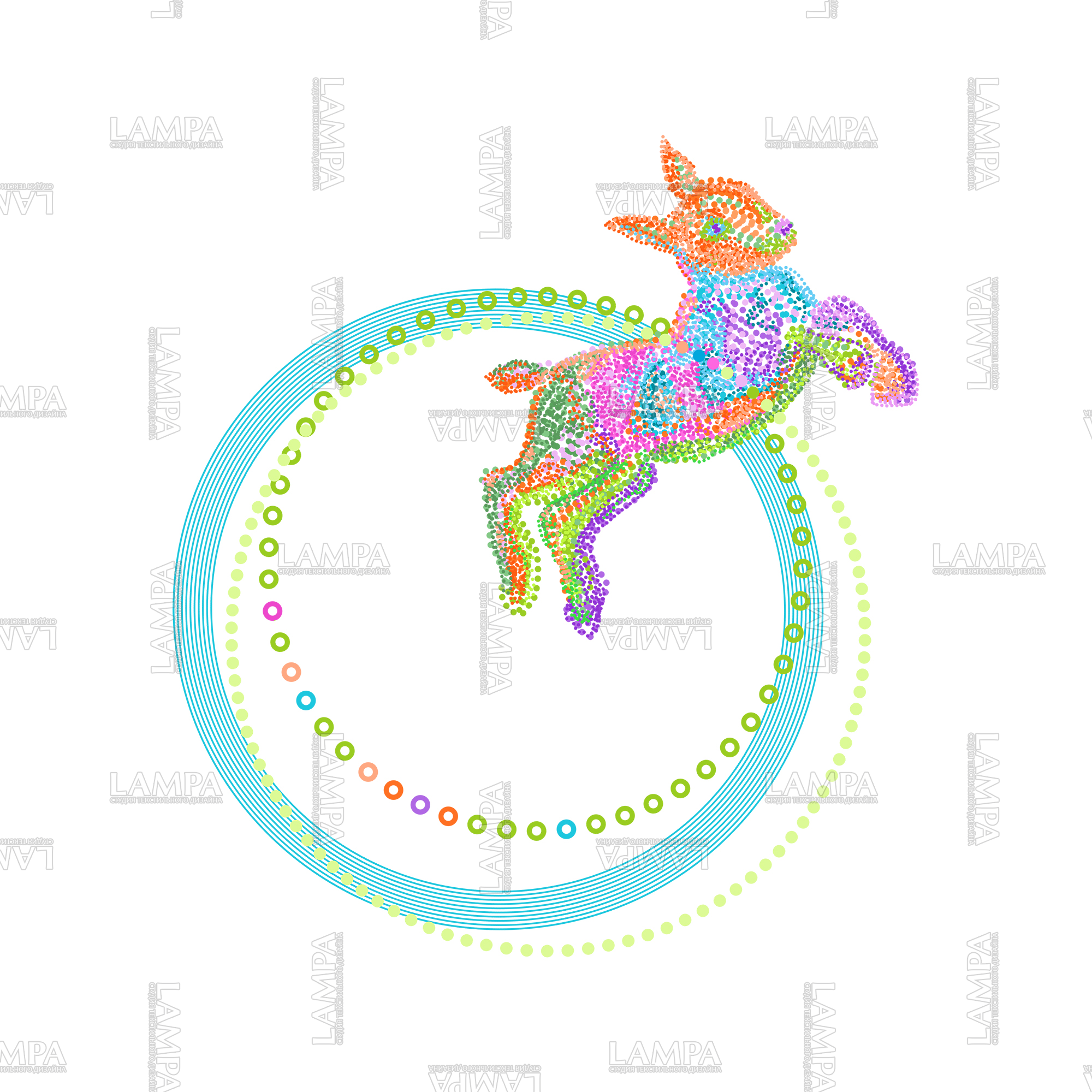 Радужный радостный козлик высоко прыгает сквозь кольца. При желании можно внутрь добавить слоган.