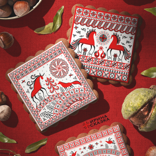 Квадратная композиция из девяти элементов в стиле мезенской росписи.