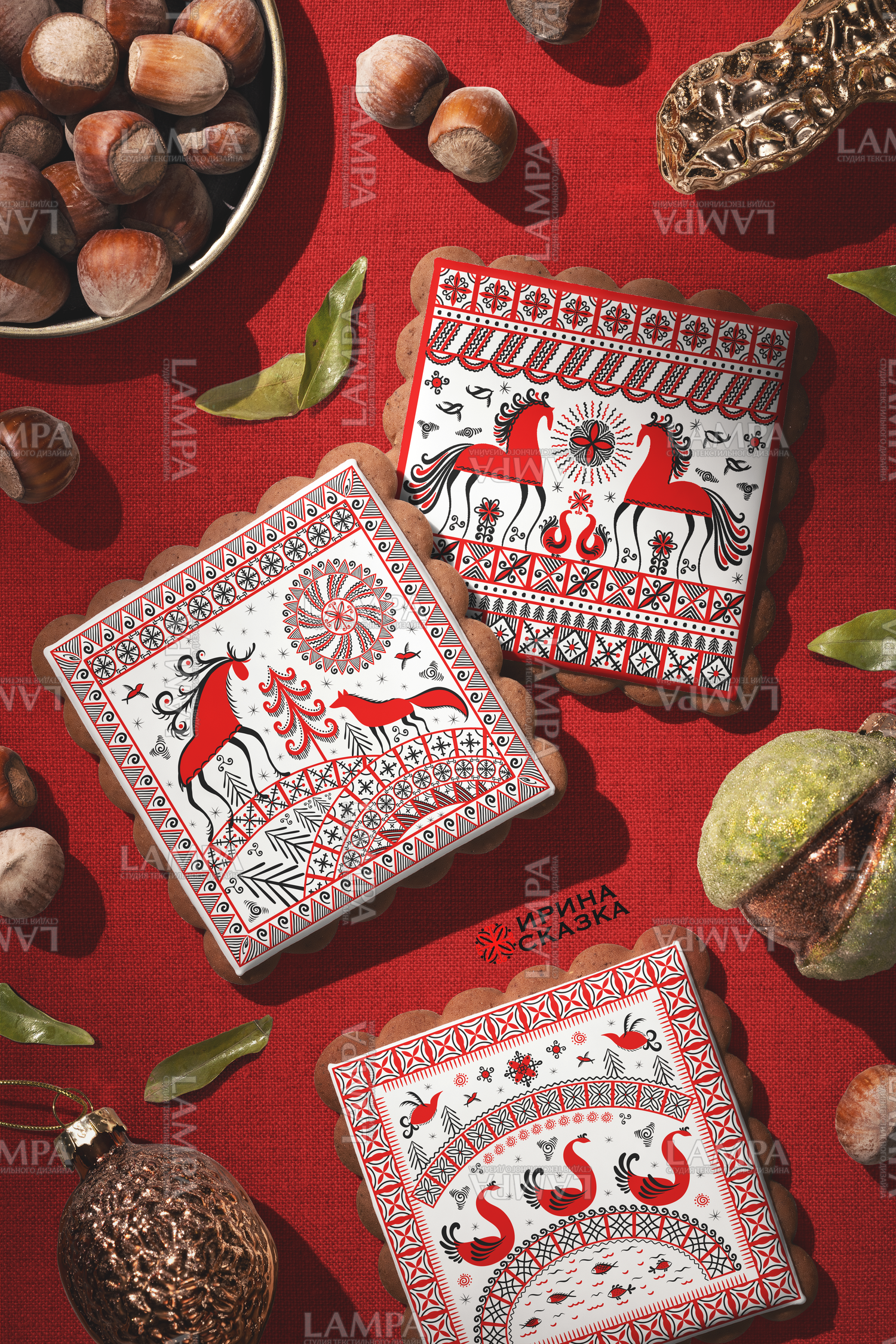 мезень, мезенская роспись, русский, квадратный, векторный, орнамент, кони, красный, природа, животные