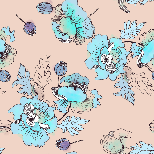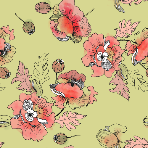 Начало весны, птицы щебечут и яркими пятнышками расцветают маки . Ботанический цветочный паттерн с весенним настроением в мягких, тёплых оттенках.