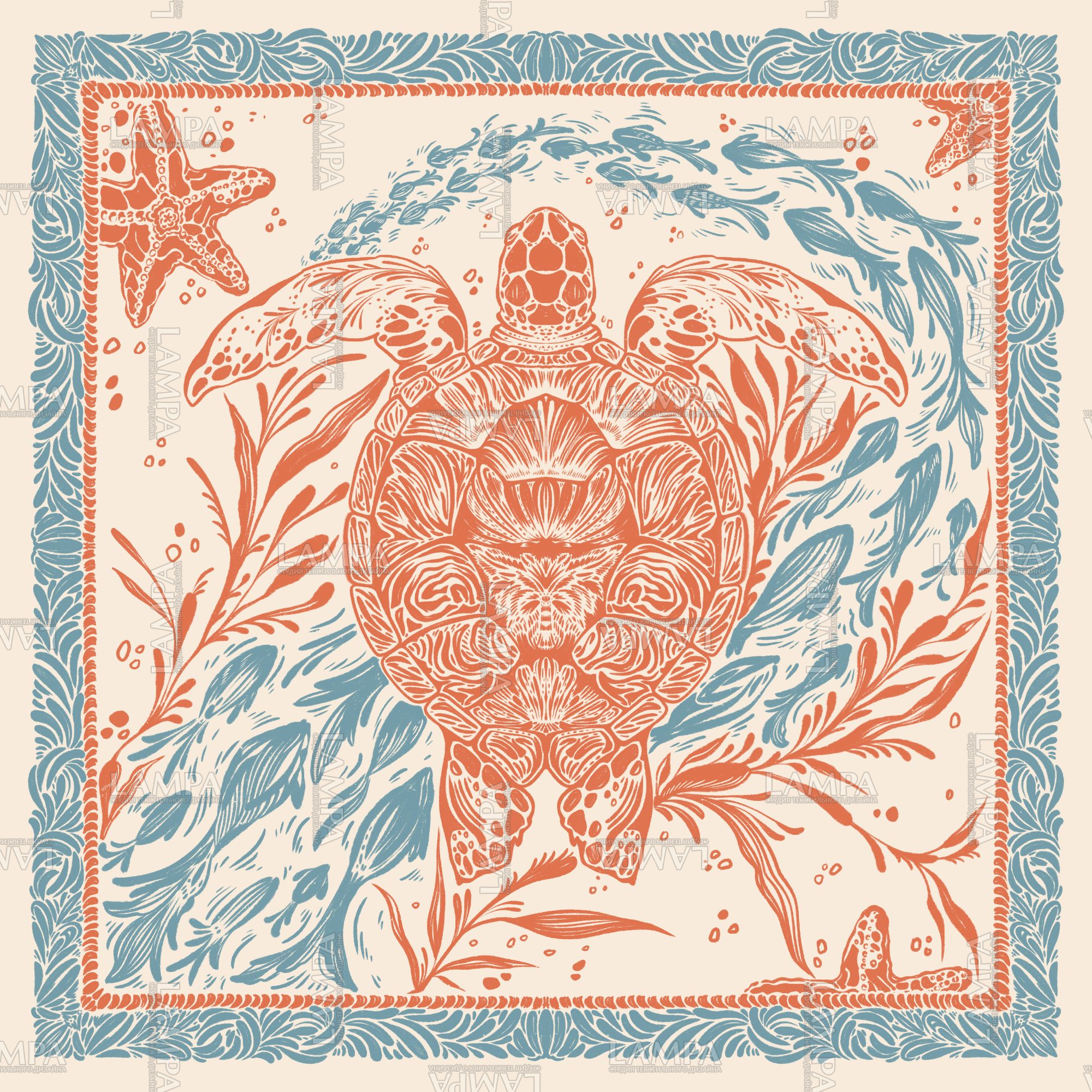 волны, море, черепаха, графика, спокойный, детальный, кисть, прорисованный, элегантный, весна, весенний, пляж, лето, ракушка, вензель, морская звезда, океан, анималистика, винтаж, ретро, лента, ленточка, синий, оранжевый, бежевый, голубой, водоросли, платок, принт, плейсмент, для посуды, интерьер, шелк