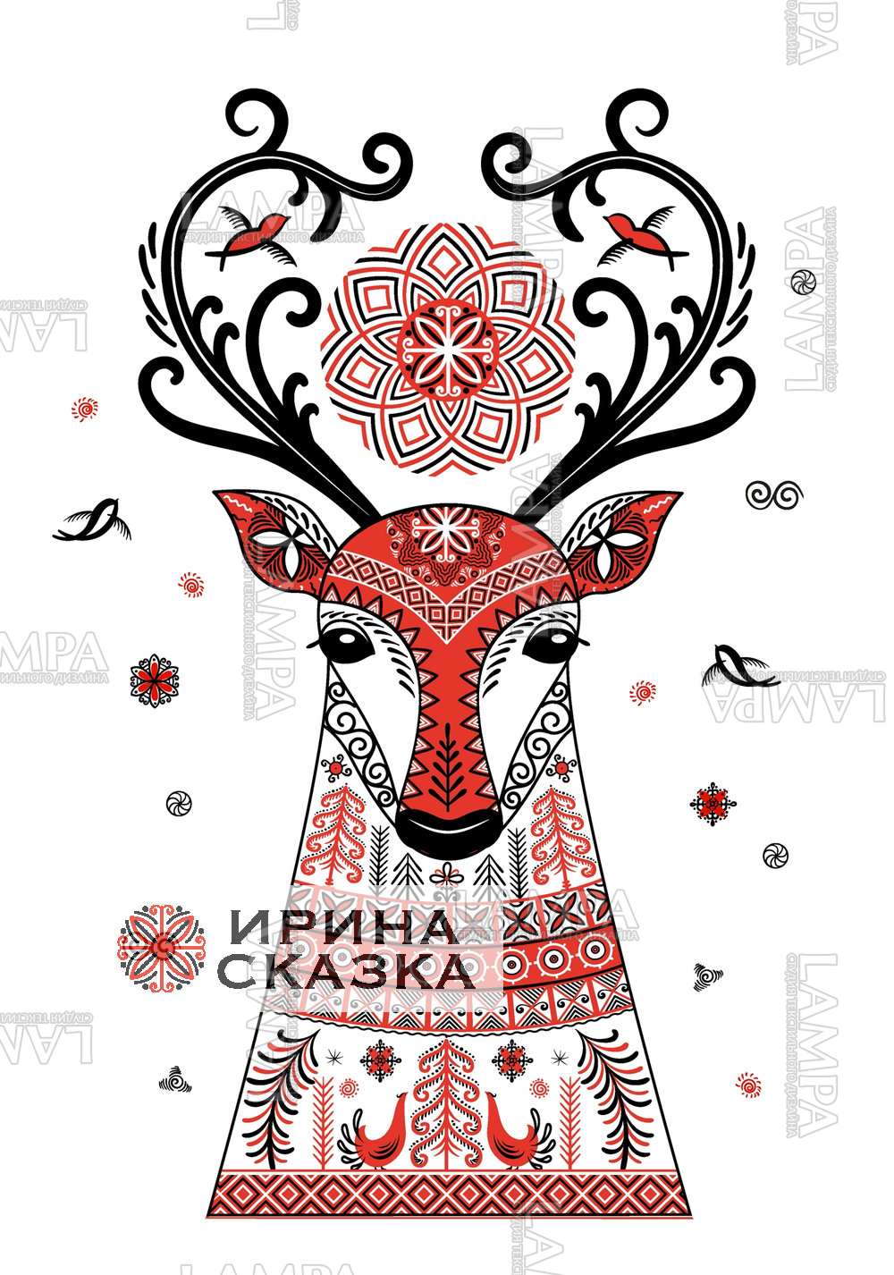 Голова оленя, солнце и птицы в стиле мезенской росписи.