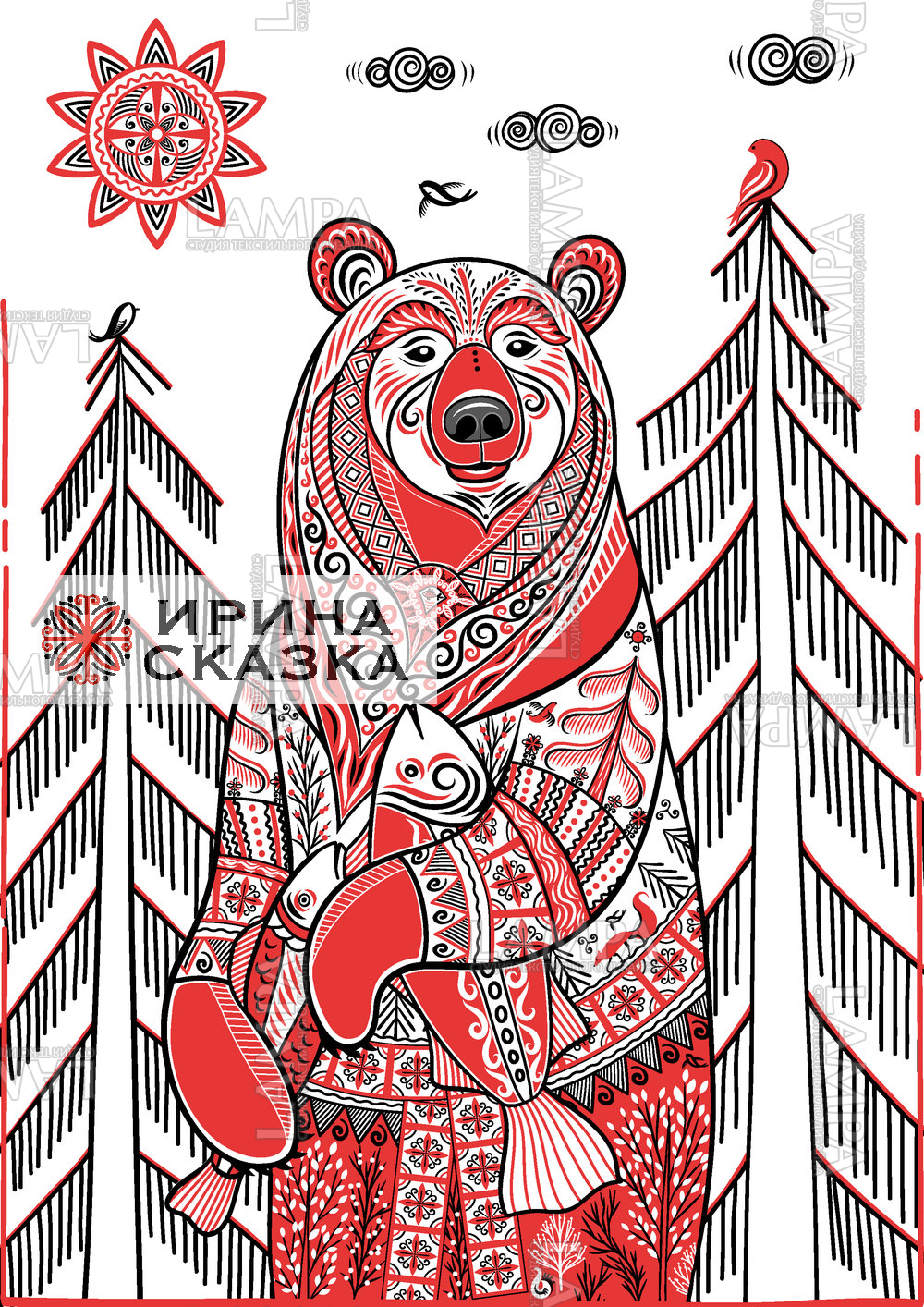 Медведь, тату, русский север, рыба, лес, мезень, мезенская роспись, символ, русский орнамент, графика, красный, черный, принт для одежды, солнце