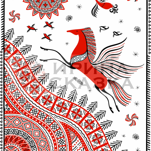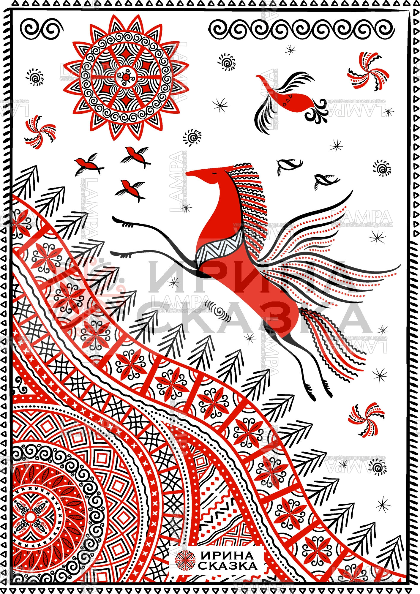 Векторная иллюстрация в стиле мезенской росписи с летящим конем, птицами над землей, украшенной орнаментами. В небе солнце - обязательный элемент мезенского стиля.