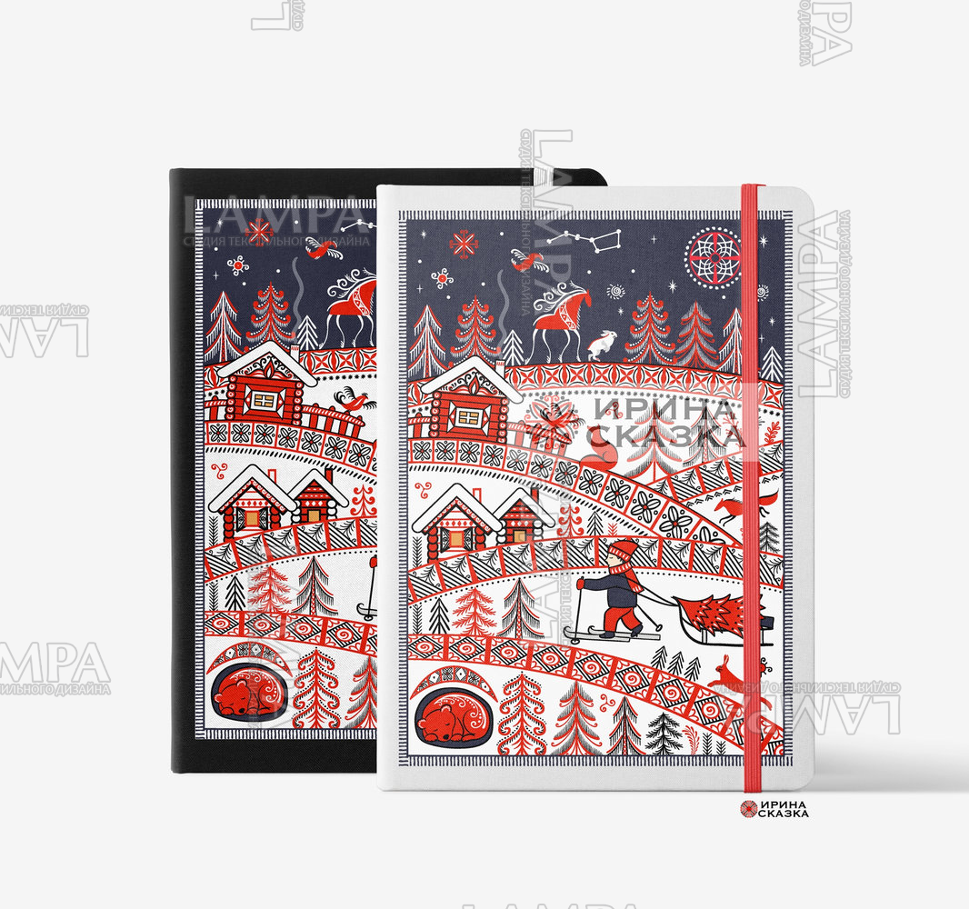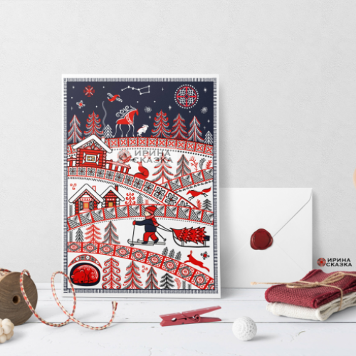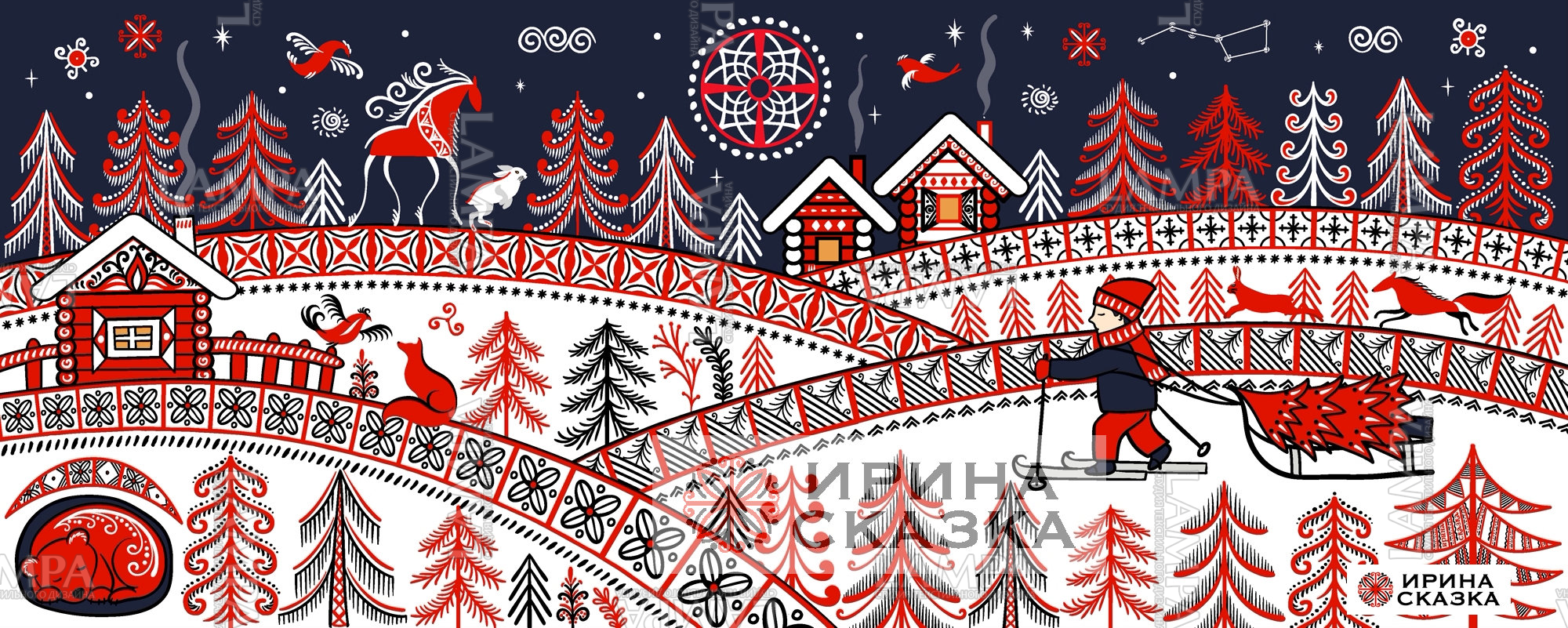 В преддверии нового года - зимняя композиция в стиле мезенской росписи для печати на открытках, блокнотах, подарочных пакетах, кружках. …