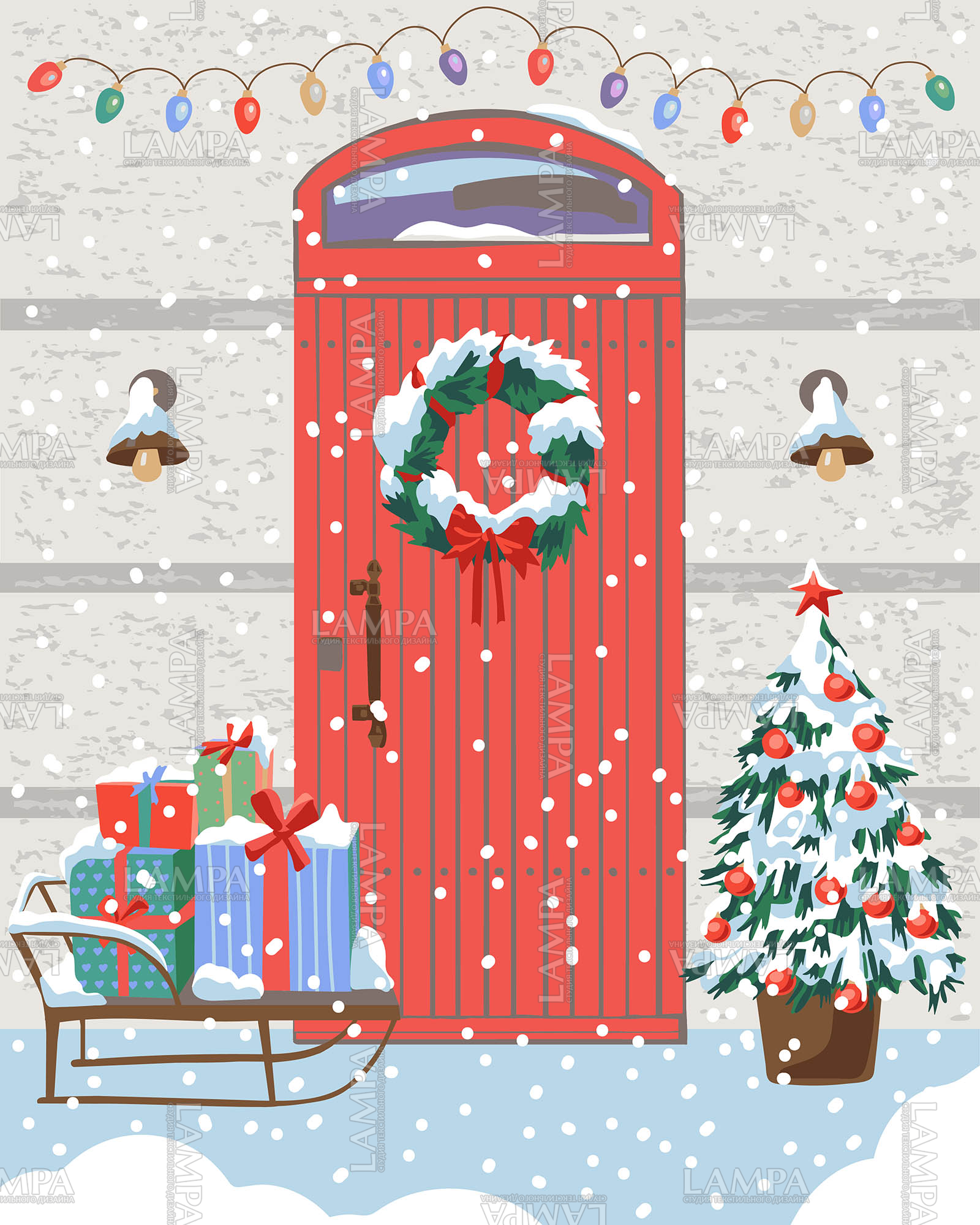 Зима Новый год Рождество декор снегопад ёлка игрушки сани венок снег праздник