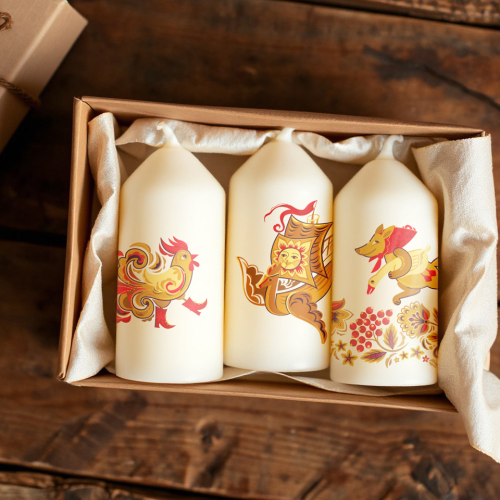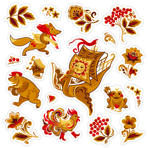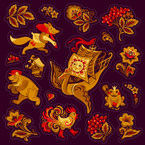 Набор векторных иллюстраций для печати на любых поверхностях. Любимые сказочные персонажи с цветочным узором по мотивам хохломской росписи в двух цветовых вариантах фона. Лиса плутовка, летучий корабль, Петя Петушок Золотой гребешок, Царевна-Лягушка, Михайло Потапыч с бочонком меда.