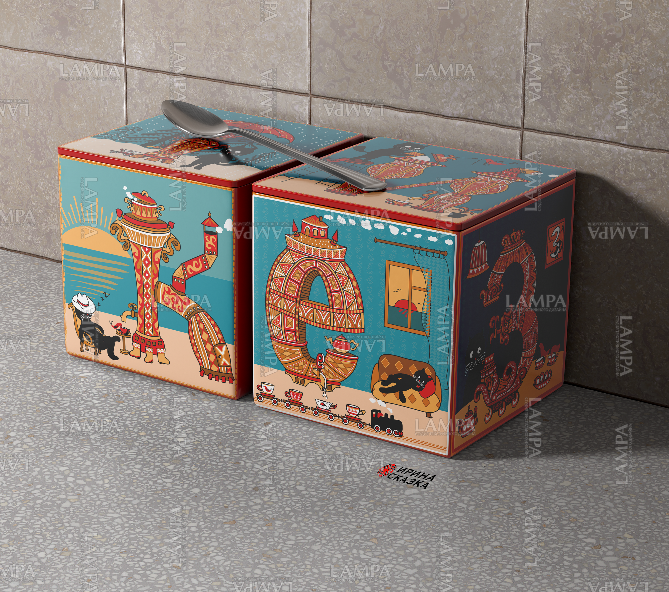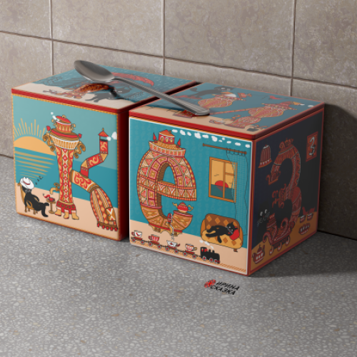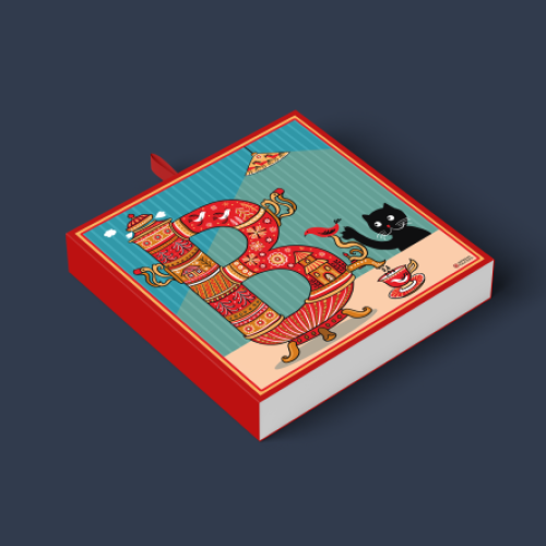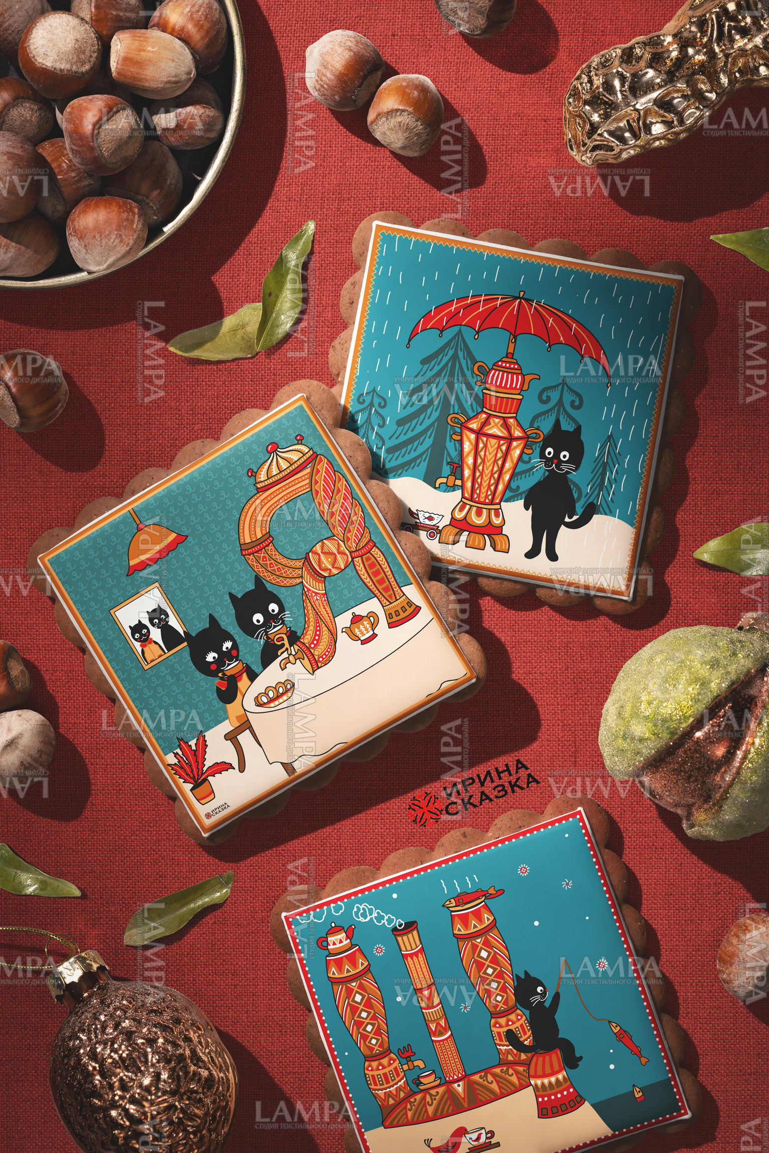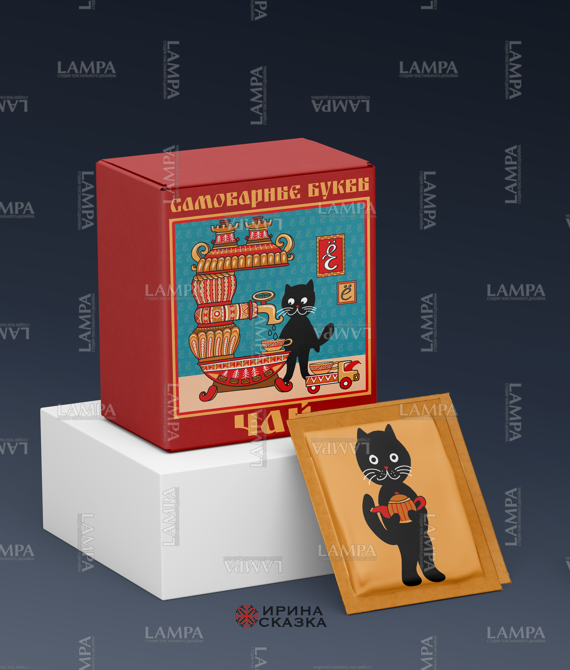 Набор состоит из 33 квадратных векторных иллюстраций, каждая из которых посвящена одной букве русского алфавита. Ключевая идея — объединение традиционной русской эстетики (самовар как символ домашнего уюта и чаепития) с игривым элементом — котом, который становится главным героем «историй» на каждой картинке.