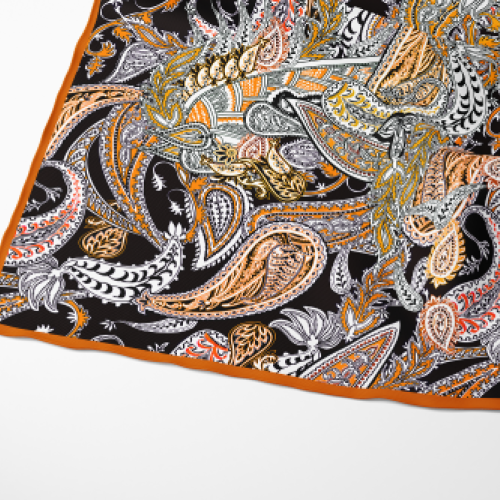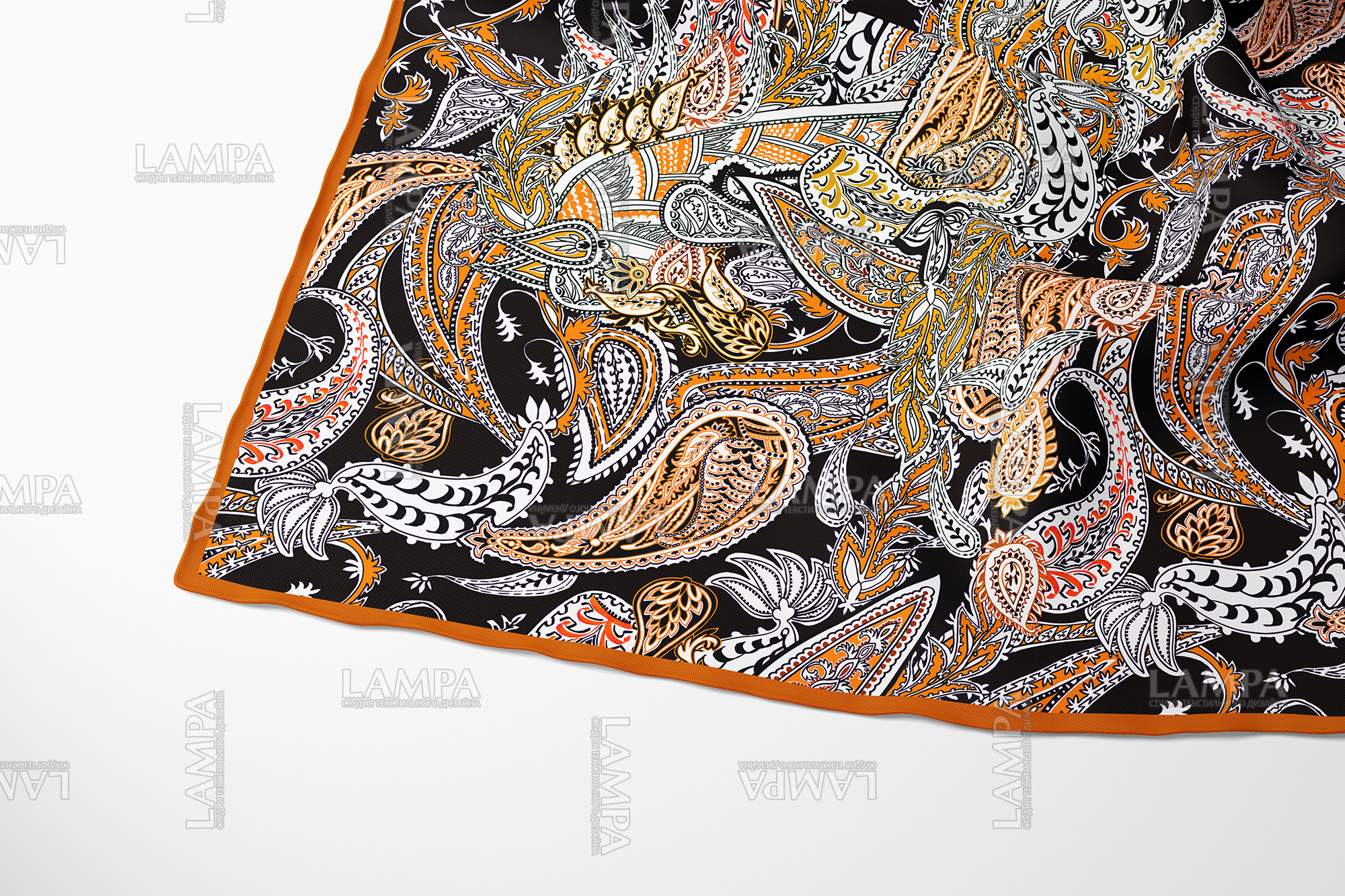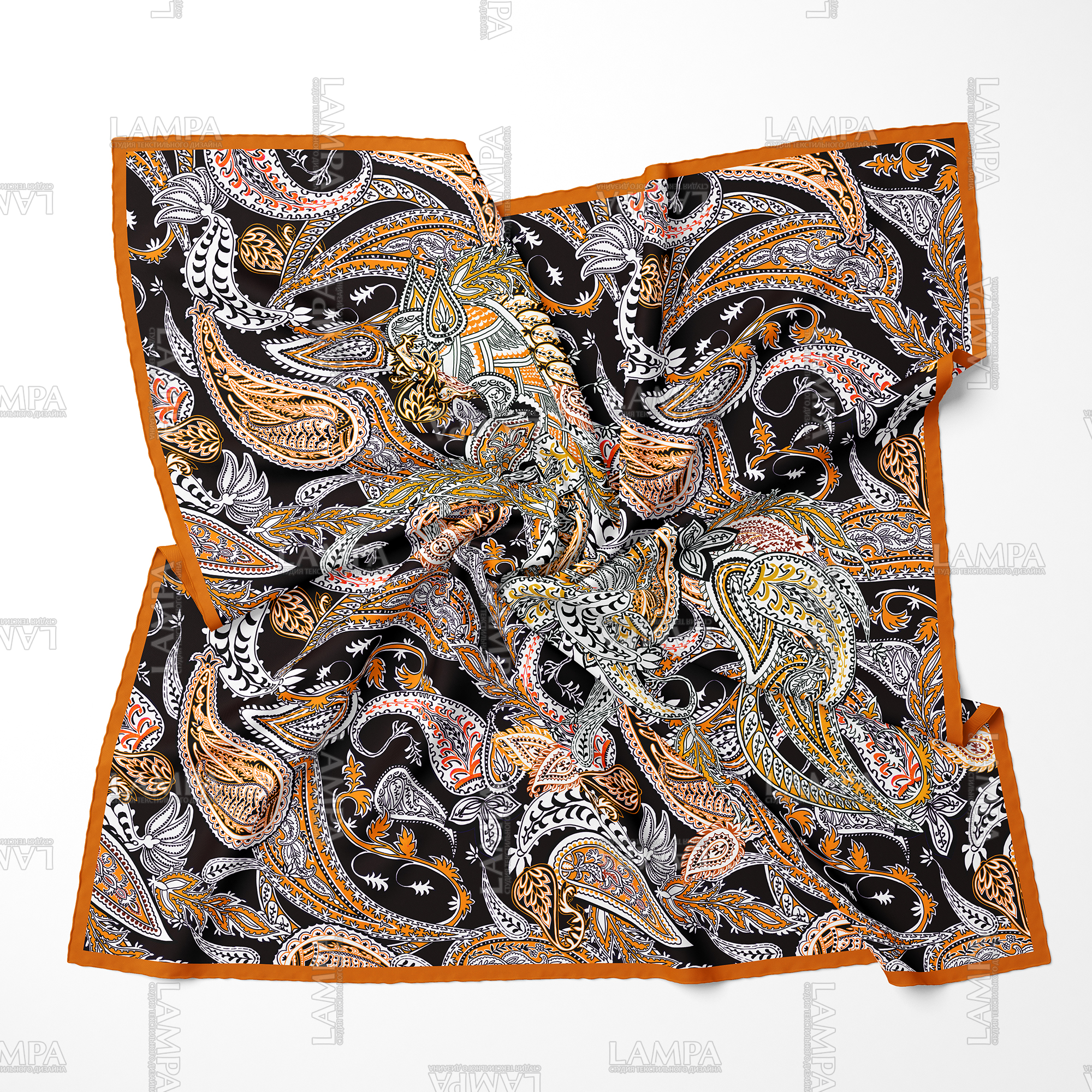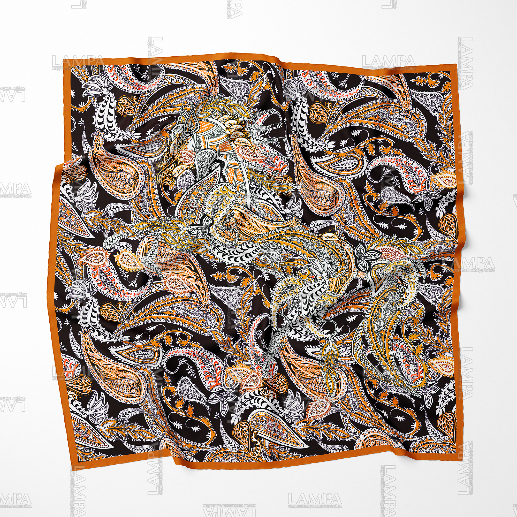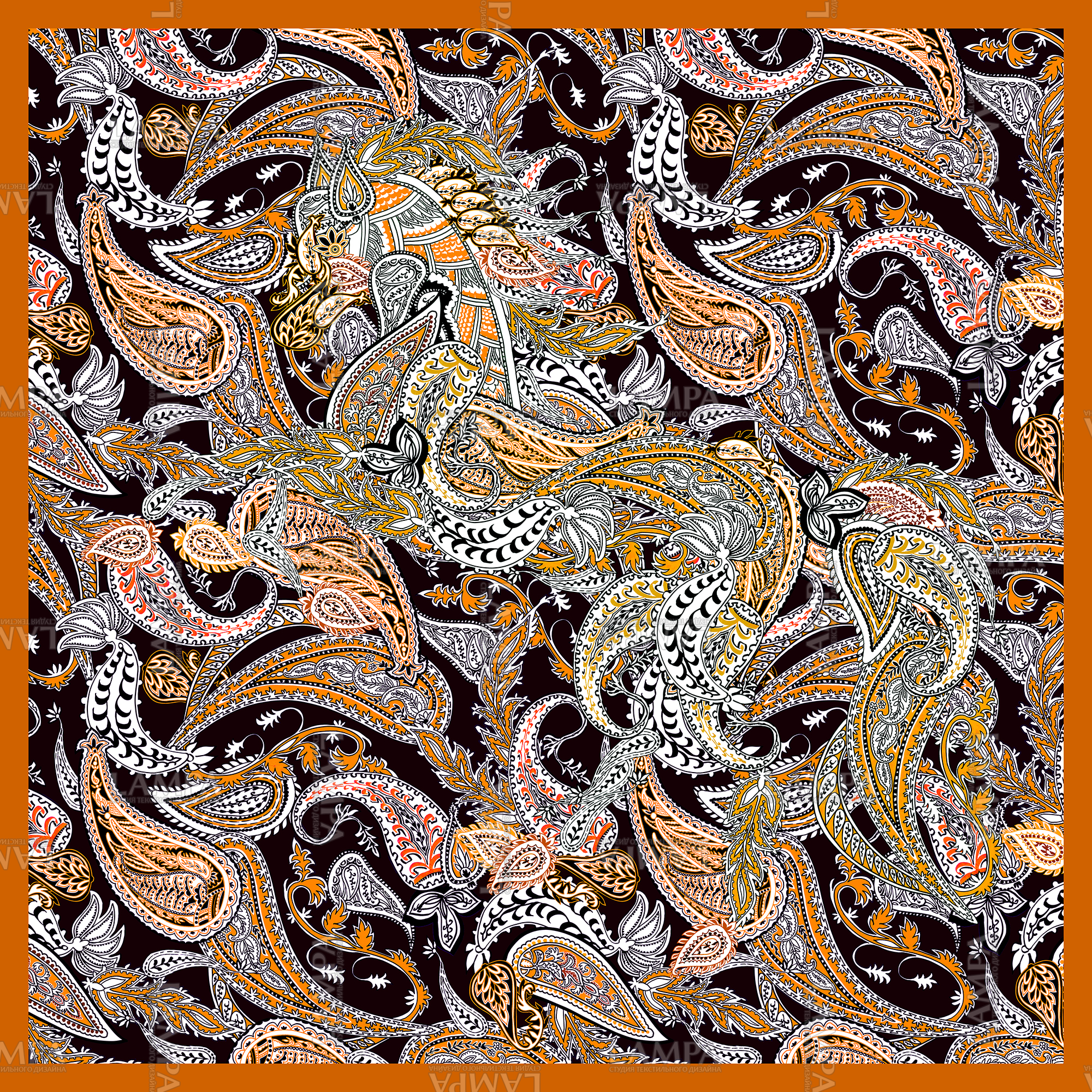 Композиция посвященная году Красной Огненной Лошади - символу 2026 года по восточному календарю. Орнамент пейсли (турецкий огурец, бута) передает динамику и движение лошади и огня, которые соединились в платочной композиции. Бело-черно-оранжевая гамма платка подчеркивает стремительный, яркий и независимый характер этого знака. Рисунок для платка, подарка, рекламного баннера