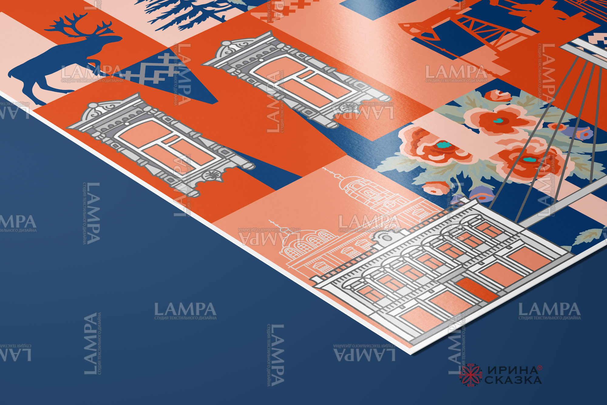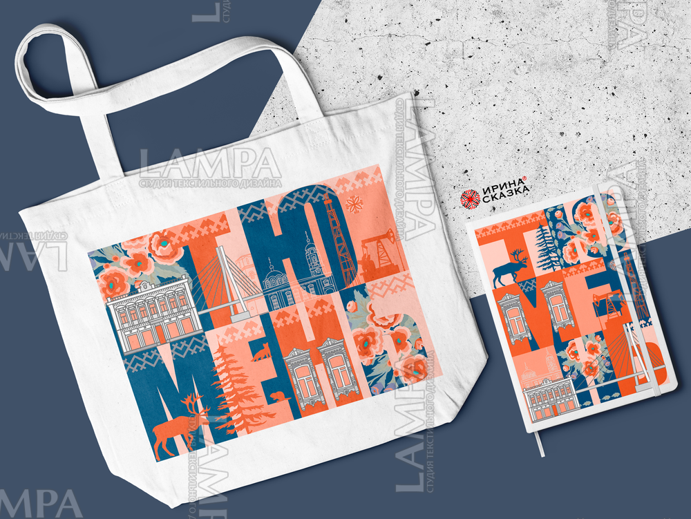 Здесь элементы тюменского ковра, окна с наличниками, нефтяная вышка, узоры ханты и манси, мост влюбленных, достопримечательности в виде зданий, животные края.