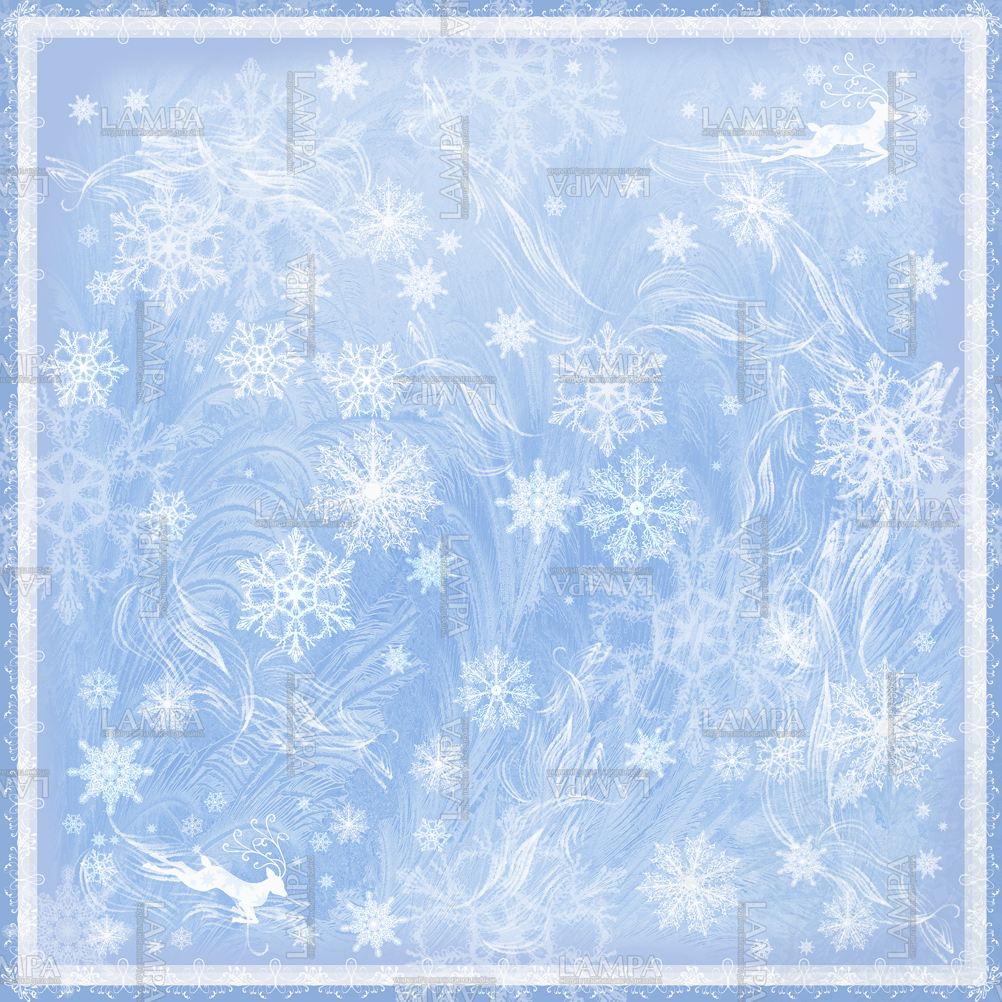Дизайн для платка с зимним настроением . Лёгкие, ажурные снежинки, северные олени -кружатся в зимнем танце . Платок с таким дизайном , дополнит новогодний образ, добавит праздничного настроения.