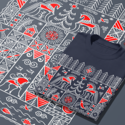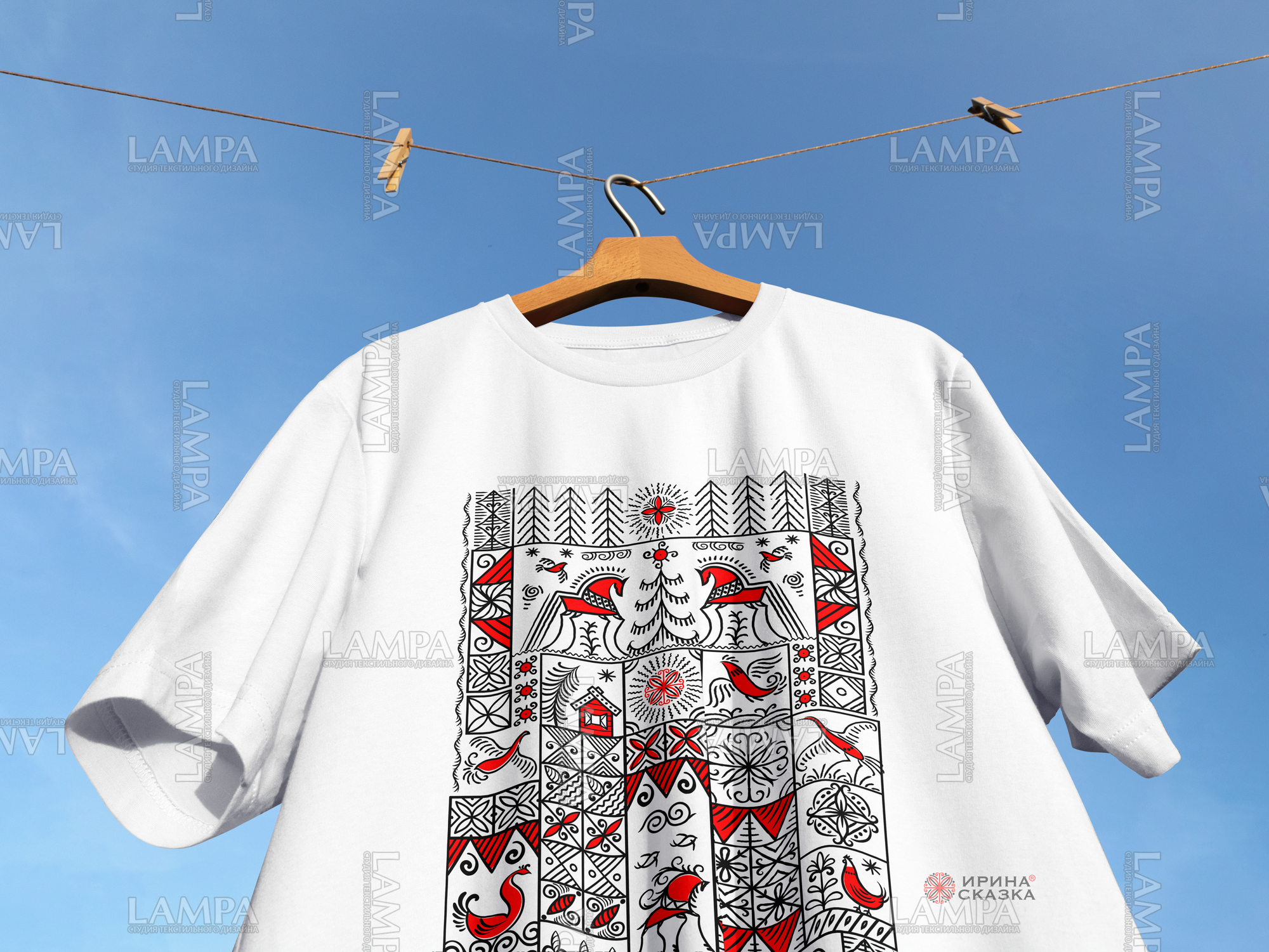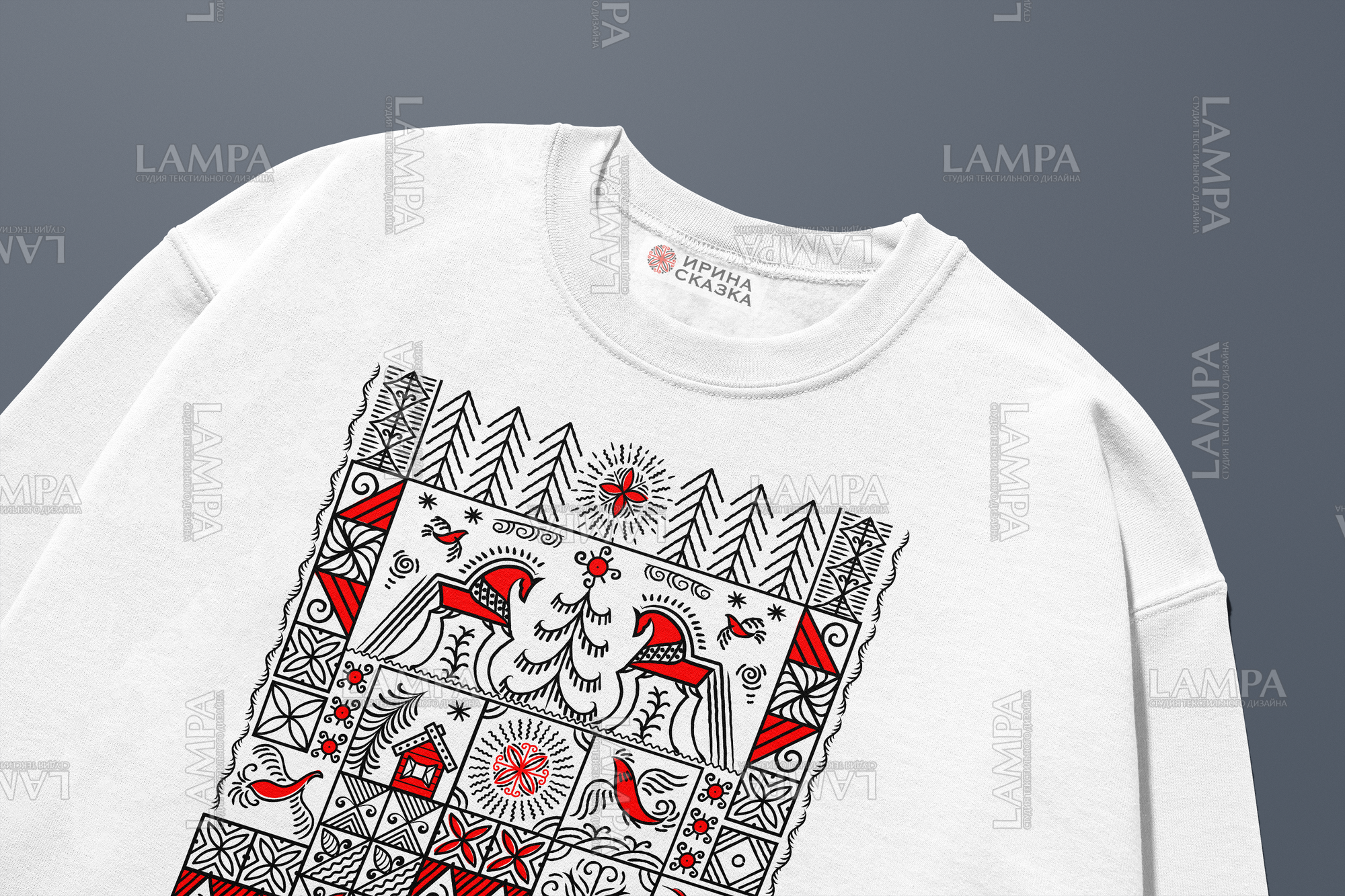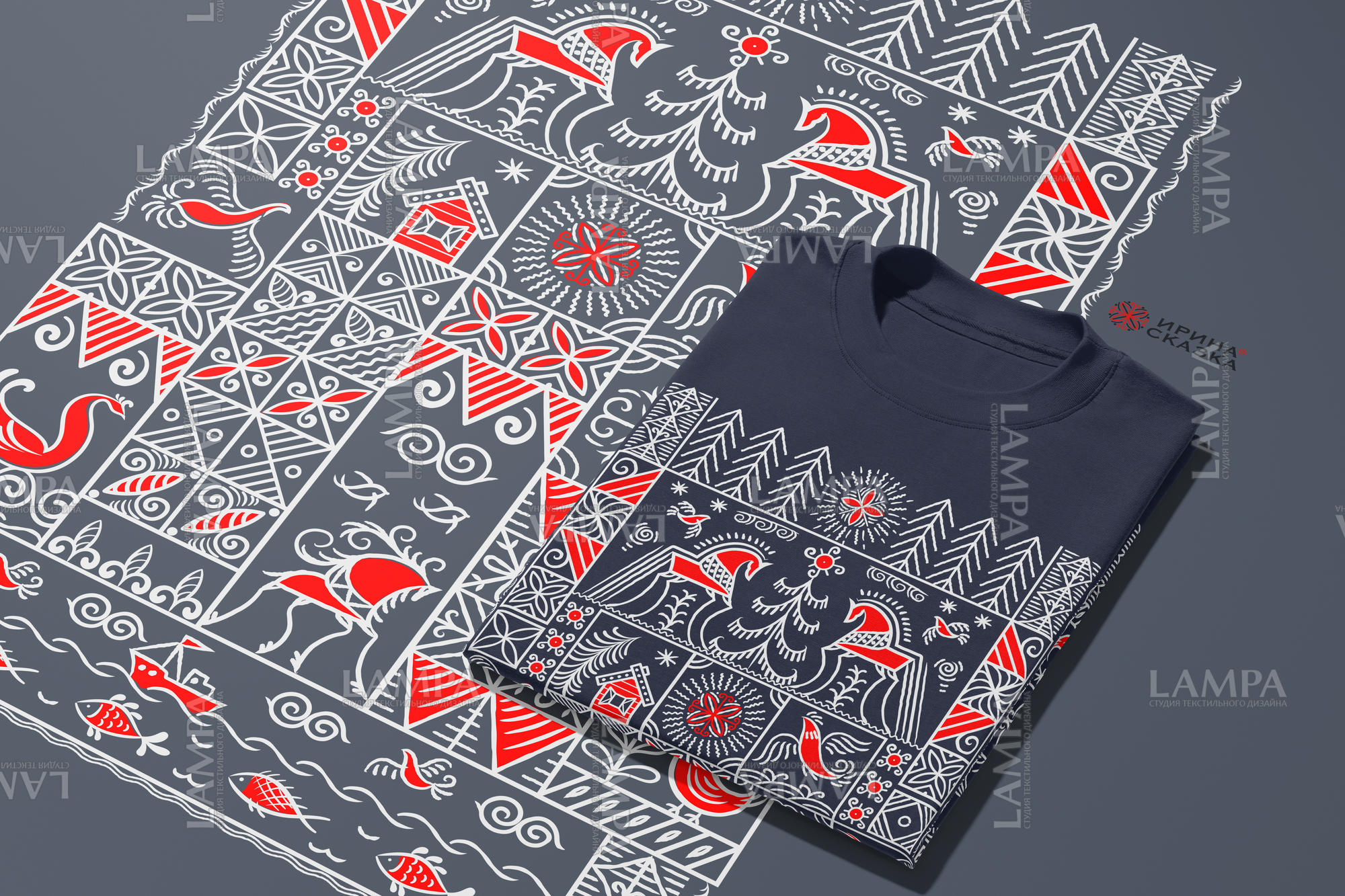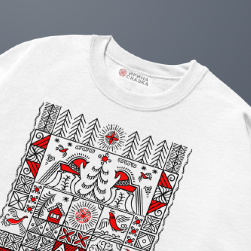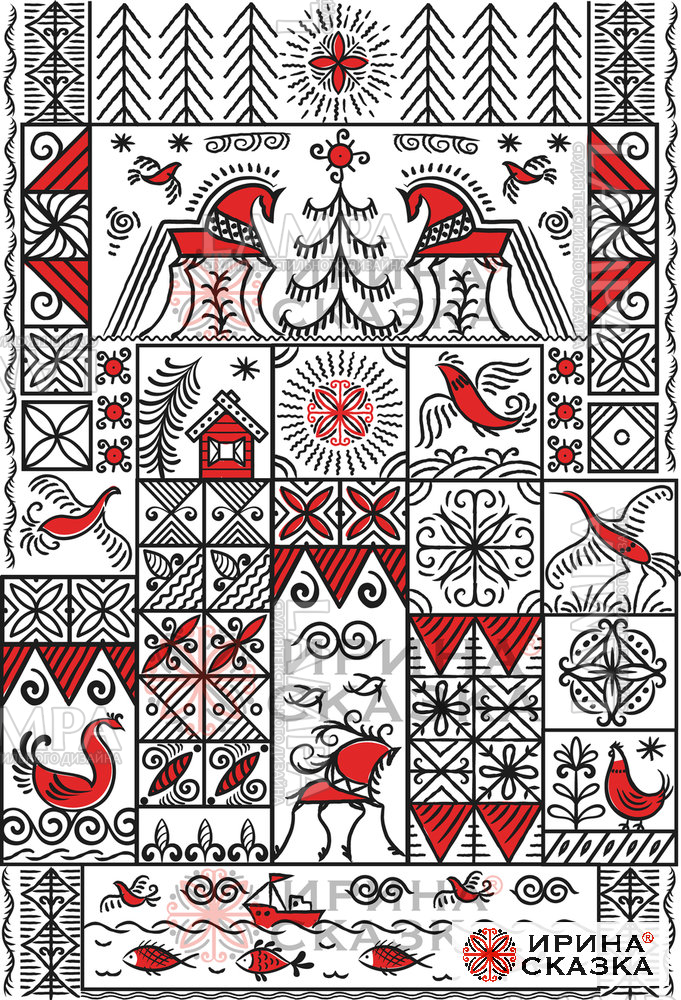 Векторная иллюстрация выполнена в аутентичном стиле мезенской росписи . Композиция строится на строгой геометрической основе: квадратные и прямоугольные модули с минималистичными сюжетами.