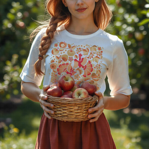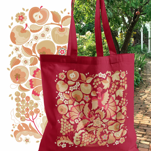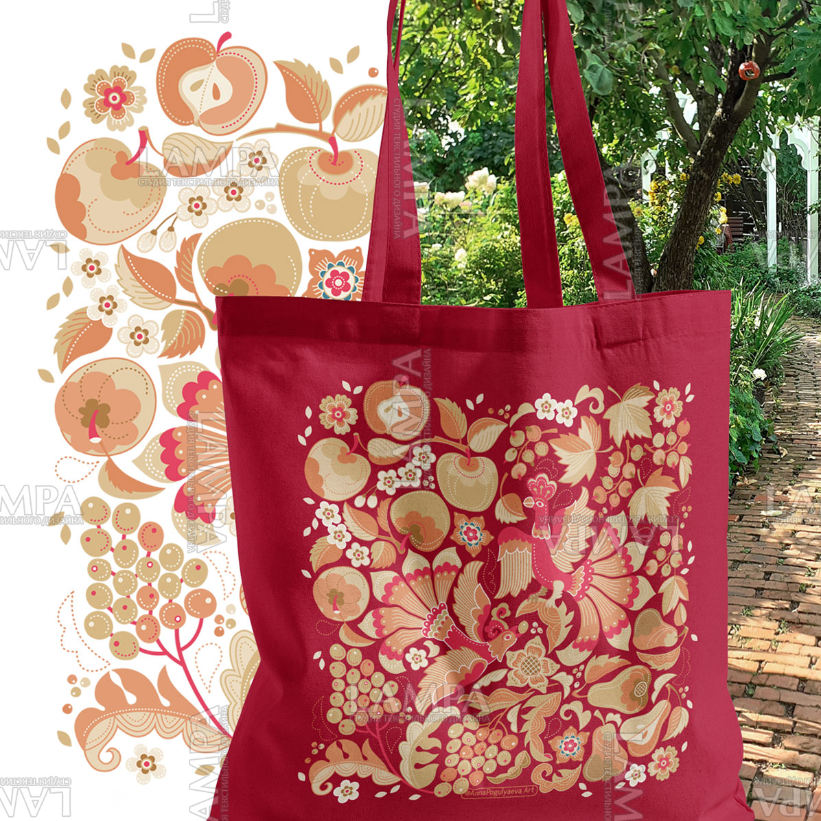 Этот принт отлично сочетается с принтом для ткани и аксессуаров «Русский сад: цветы, плоды и птицы», его возможно использовать для одежды, шопперов, аксессуаров, интерьерного и кухонного текстиля.