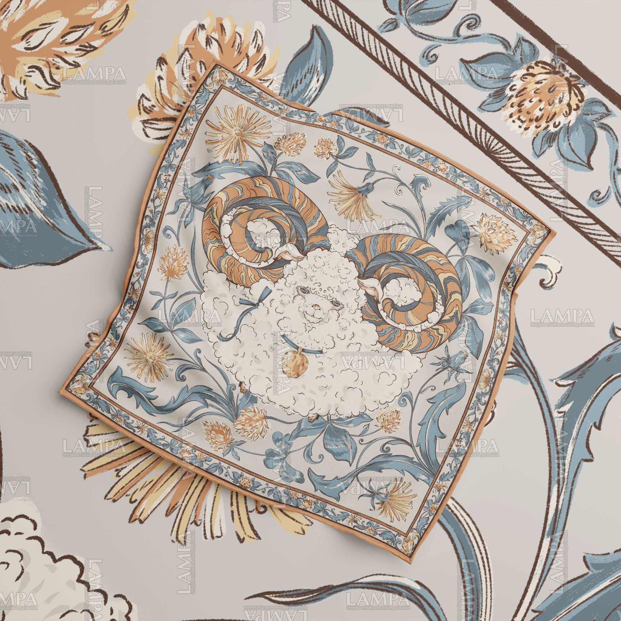 ботаника, овца, овечка, графика, баран, спокойный, детальный, весна, новый год, элегантный, год овцы, весенний, пляж, лето, одуванчик, вензель, клевер, анималистика, винтаж, ретро, лента, ленточка, синий, оранжевый, бежевый, платок, принт, плейсмент, для посуды, интерьер, шелк, русский, русский стиль, набойка, цветочный, цветок
