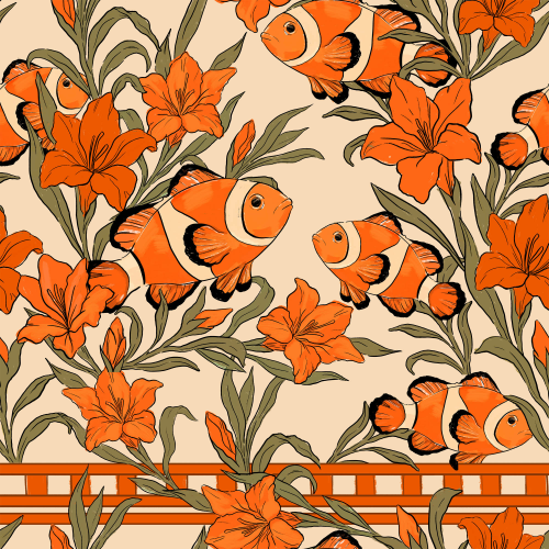 Принт с графичными рыбами. Файл PSD, отдельные рыбки, пятна и фон с возможностью замены цвета. Морской принт, рыбки, тропики, летний принт