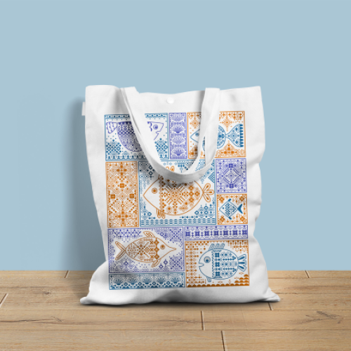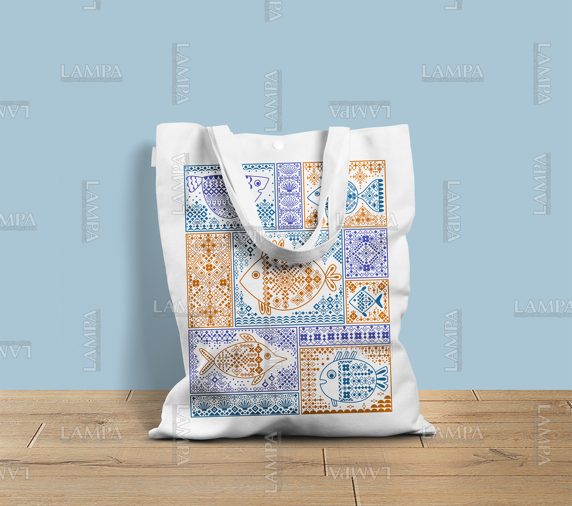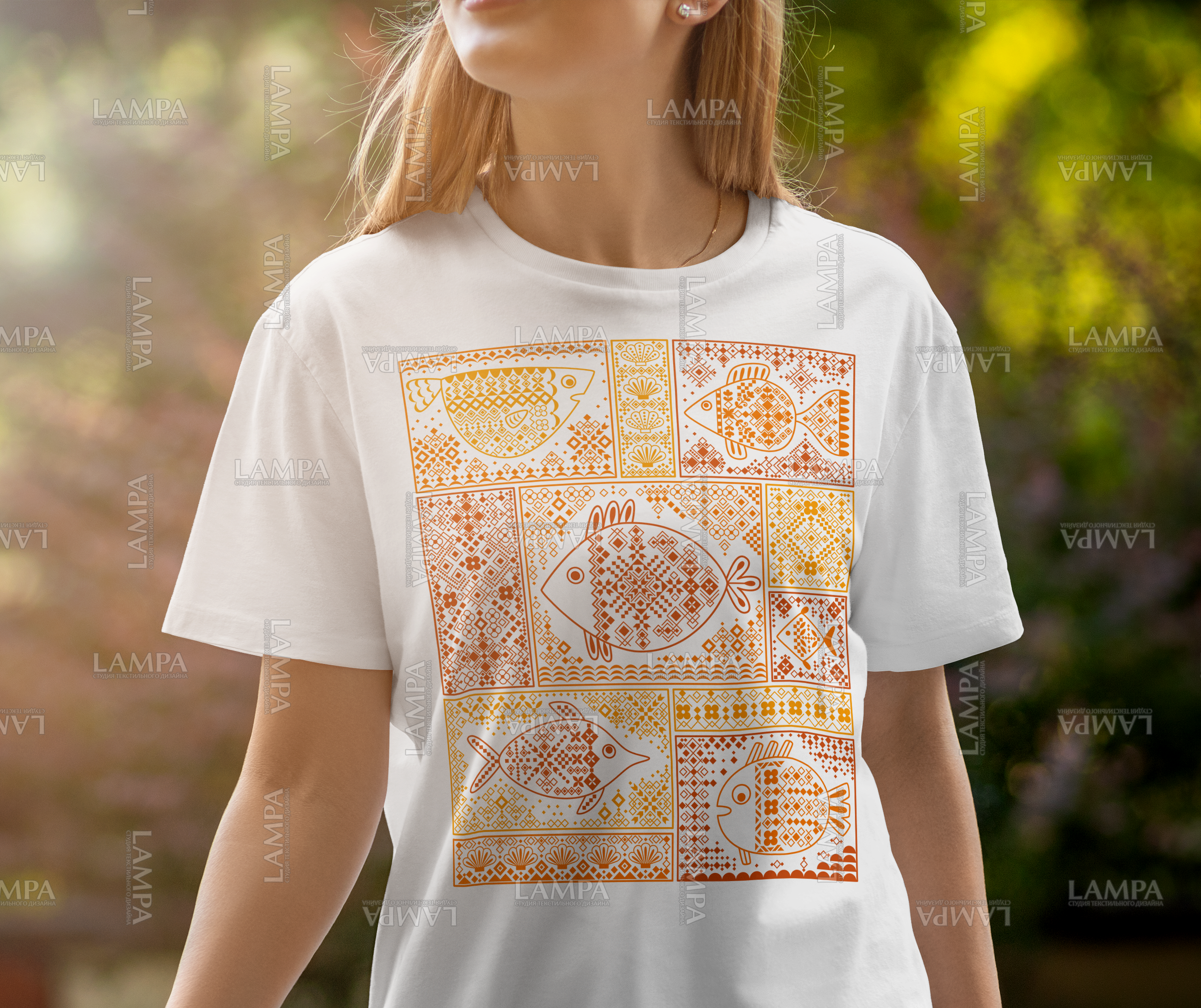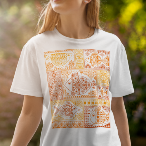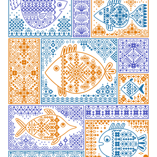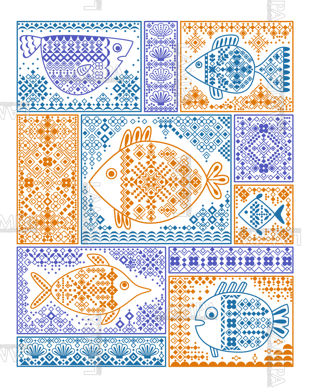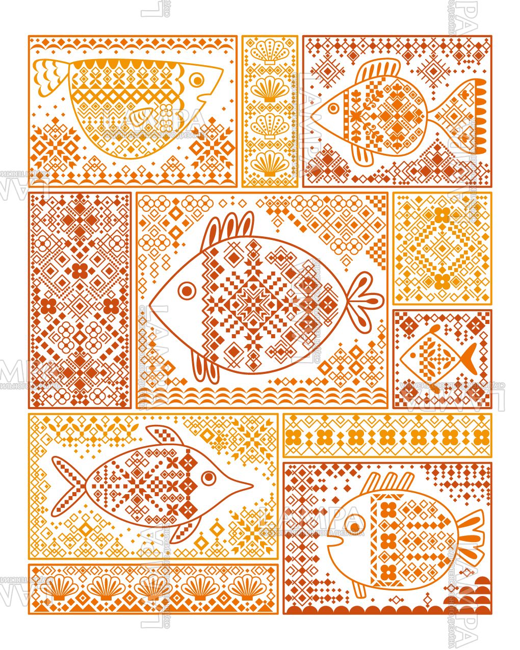 Рыбы, плавающие в орнаментах. Стилизованные формы рыб органично вписаны в узоры из точных линий и геометрических форм.