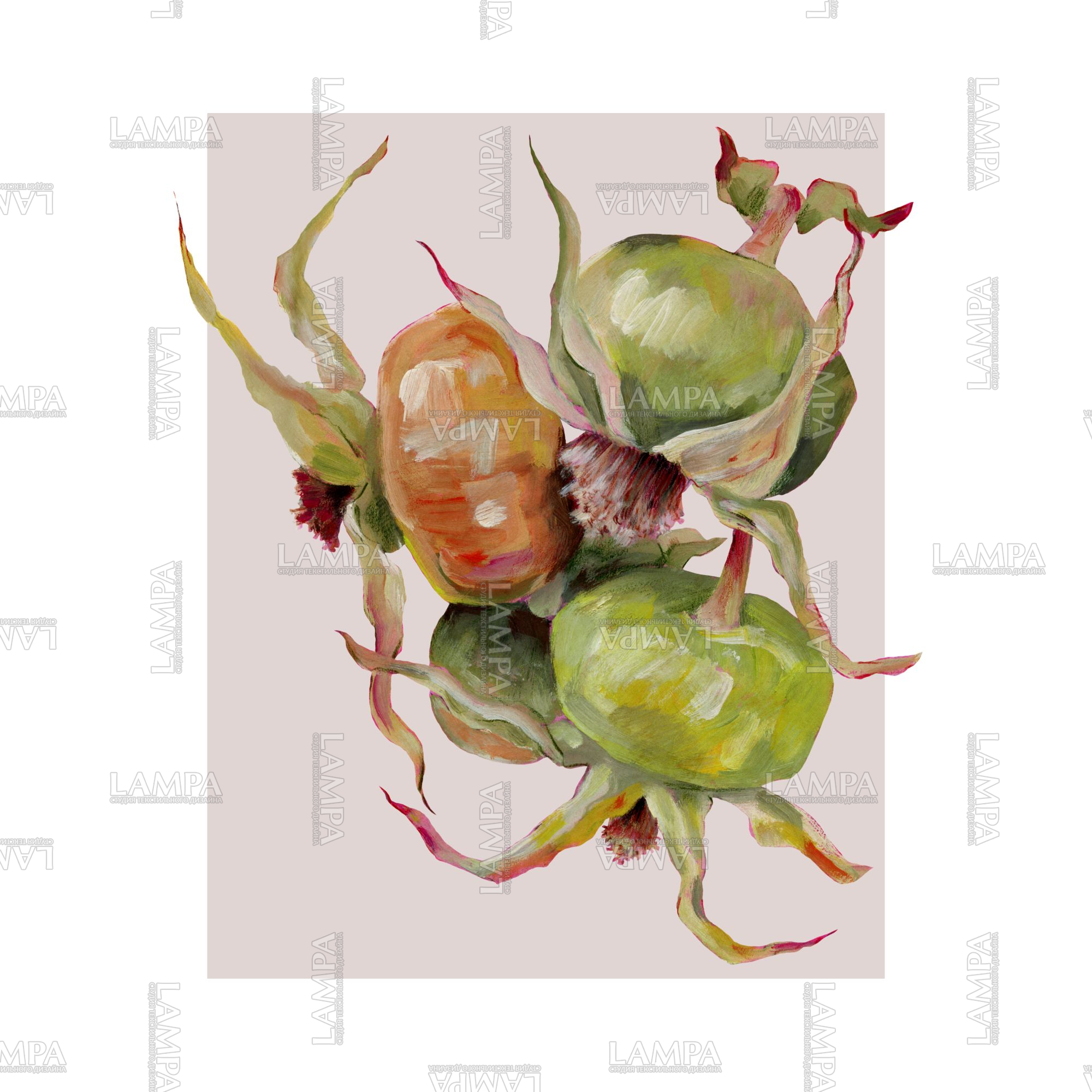 Яркий ботанический принт плодов шиповника. Живой рисунок гуашью с цифровой доработкой. Подойдет для летней одежды, футболок, сумок, купальных костюмов, аксессуаров, интерьера и домашнего текстиля, а так же канцелярии и бумаги, брендирования, упаковок.